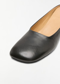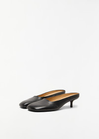 Marsell black kitten-heel mules with a squared toe and soft tan leather lining in shiny smooth leather. Features soft tan leather lining, leather outsole, and a thin stacked heel. Sizing: European (36-41). Color: Black. Smooth Leather. Made in Italy. SS25MA003