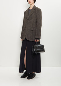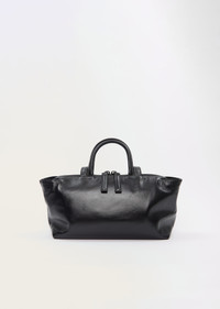 Marsell signature top-handle bag in mini size in black polished leather with a shiny finish. Features cinched sides, top zip closure, side snaps for an adjustable shape, interior flap pockets, interior leather patch pockets and a single zip pocket. Optional crossbody strap included. Multiple carrying options Measures approximately: 6 H x 10 W x 5 D in. Handle drop: 4 in. Color: Black. 100% Calf Leather. Made in Italy. FW25MA010