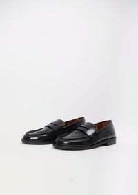Marsell black loafer with a round toe and tonal stitching handcrafted in matte patent leather. Features a hand-colored natural leather sole with a stacked leather heel. Sizing: European (36-41). Color: Black. Patent Calfskin. Made in Italy. FW25MA005