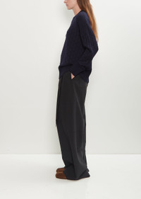 Plan C dark blue long sleeve sweater with a crew neck and dropped shoulders in mid-weight soft merino wool knit with a checkered three-dimensional pattern. Features ribbed trim finish at neckline, cuffs, and hem. Relaxed fit. Worn with: Wool Wide Trousers and Leather Lace Up Shoes — Sequoia . Sizing: Italian (36-44). 36=XXS, 38=XS, 40=S, 42=M, 44=L. Natalie is 5'10” (178cm), bust 33”, waist 25.5”, hips 35” and wears a 40. Color: Dark Blue. 100% Merino Wool. Made in Italy. FW25PC007