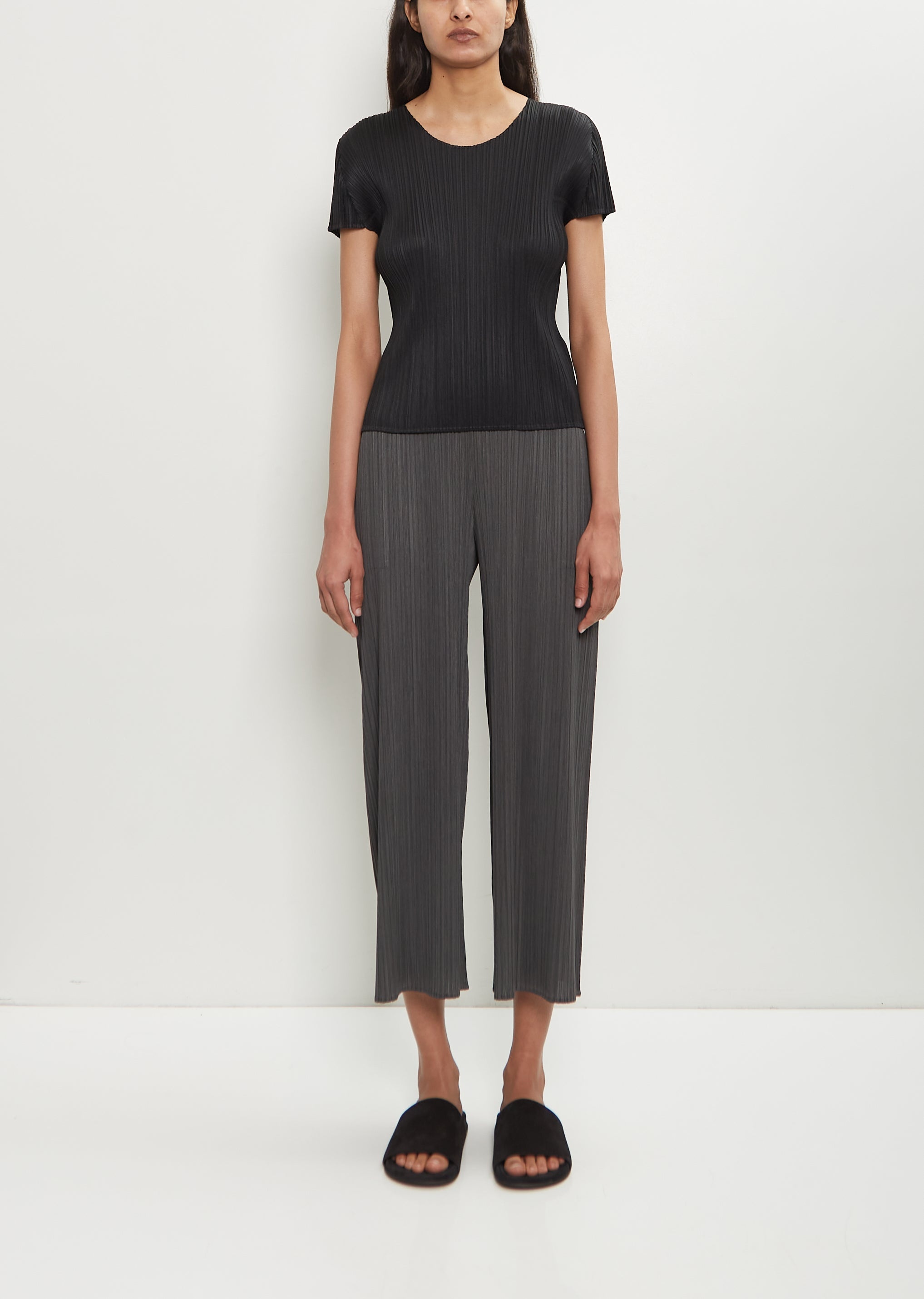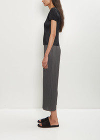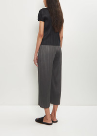 Pleats Please by Issey Miyake charcoal gray pull-on pants with cropped, wide legs in signature pleated chiffon fabric. Features an elasticated waist and side seam pockets. Sizing: Designer's unique sizing (2-5). 2 = 24.4 in Waist, 34 in Length. 3 = 24.4 in Waist, 35.6 in Length. 4 = 25.6 in Waist, 37.2 in Length. 5 = 25.6 in Waist, 38.8 in Length. Priyanka is 5' 9.5” (177cm), bust 32”, waist 24”, hips 34.5” and wears a size 4. Color: Charcoal Gray. 100% Polyester. Made in Japan. SS25PP019