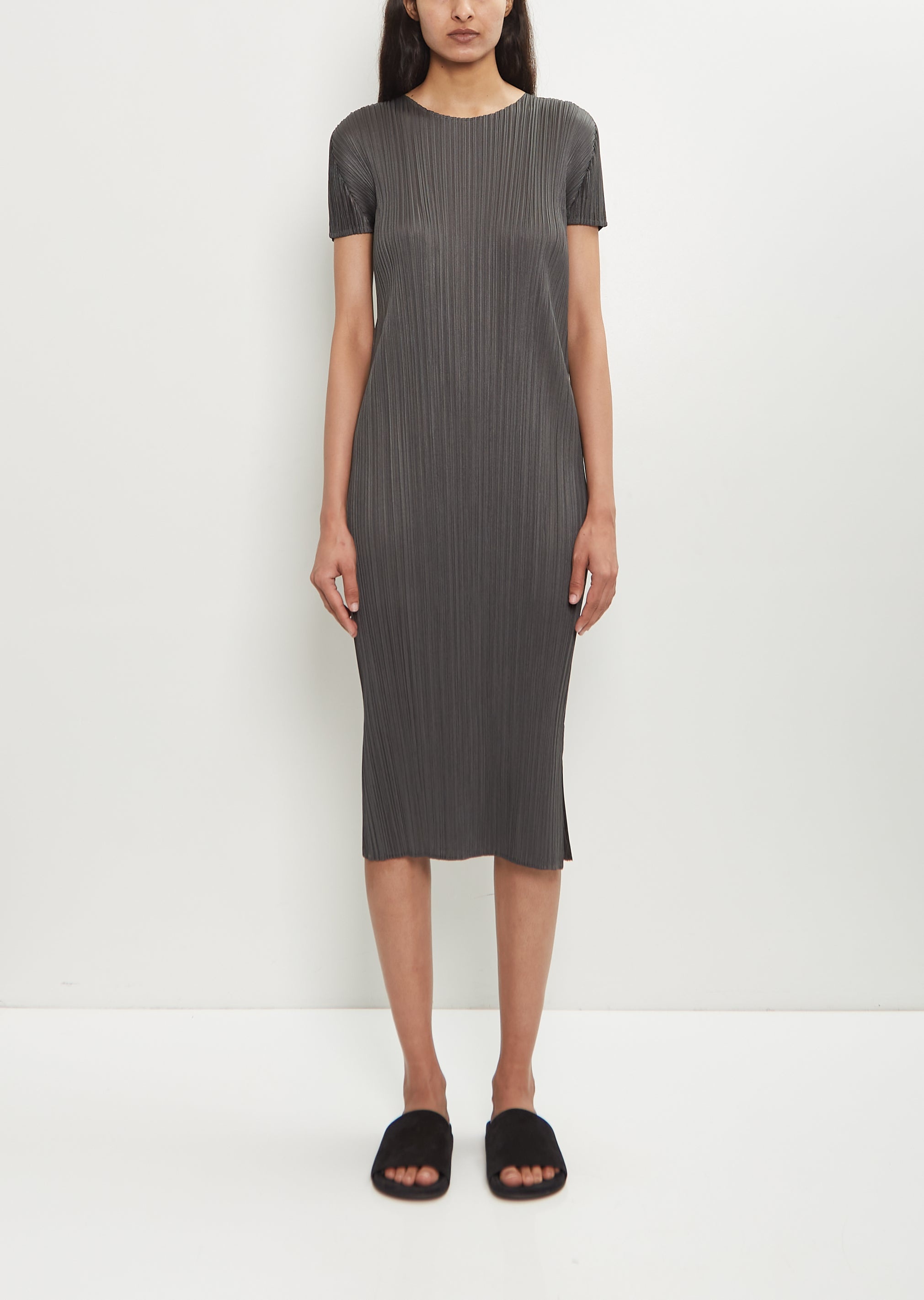 Pleats Please by Issey Miyake charcoal gray short sleeve dress with a round neckline and dropped shoulders in signature pleated technical chiffon. Closer fit. Sizing: Designer's unique sizing (2-5). 2 = 42.5 in Length, 17.7 in Sleeve Length. 3 = 44.3 in Length, 17.7 in Sleeve Length. 4 = 46 in Length, 18.1 in Sleeve Length. 5 = 47.8 in Length, 18.1 in Sleeve Length. Priyanka is 5' 9.5” (177cm), bust 32”, waist 24”, hips 34.5” and wears a size 4. Color: Charcoal Gray. 100% Polyester. Made in Japan. SS25PP020