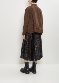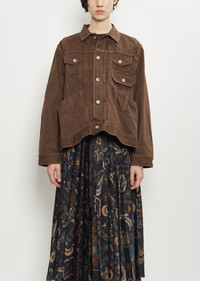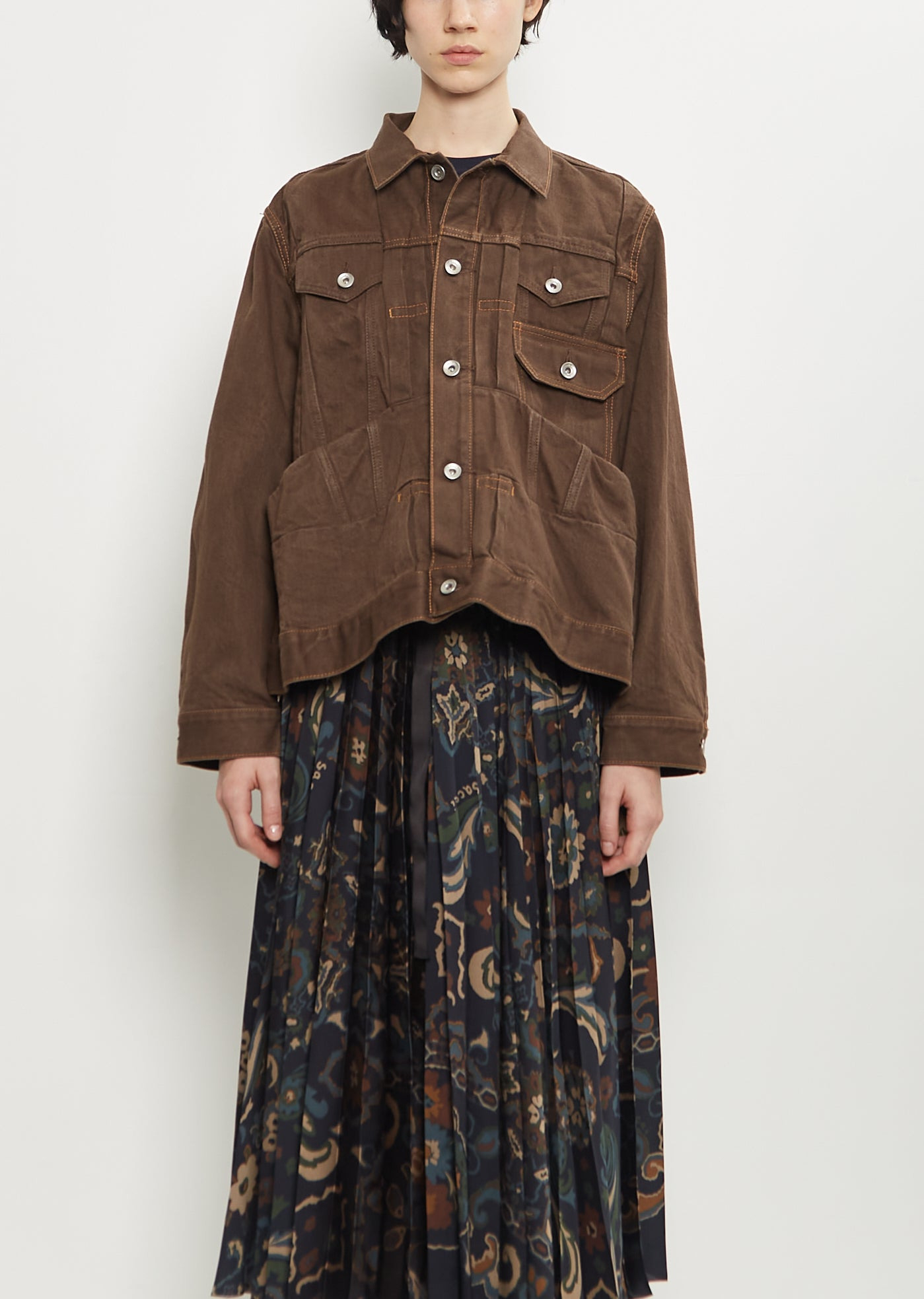Sacai brown jacket with a classic collar and silver-toned branded button front closure in cotton denim. Features three buttoned flap chest patch pockets, exaggerated front slip pockets, buttoned cuffs, and an adjustable belt detail at back. Finished with contrasting orange stitching throughout. Worn with: Floral Print Technical Satin Skirt and Rubber Boots . Sizing: Designer's unique sizing (1-3). 1=S, 2=M, 3=L. Mila is 5' 9.5” (177cm) , bust 30”, waist 24”, hips 35” and wears a size 1. Color: Brown. 100% Cotton. Made in Japan. PF25SA031