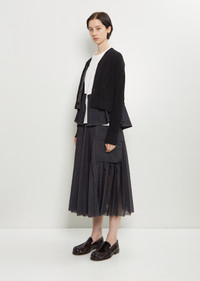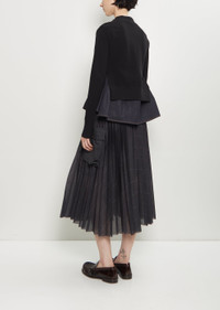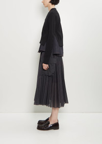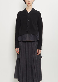 Sacai black and indigo layered cardigan with a V-neckline in mid-weight cotton knit and cotton denim. Features front welt pockets and tonal branded button closure at front. Knit layer is finished with ribbed trim at cuffs and hem. Worn with: Voile Glen Check Skirt and Patent Leather Loafer . Sizing: Designer's unique sizing (1-3). 1=S, 2=M, 3=L. Mila is 5' 9.5” (177cm) , bust 30”, waist 24”, hips 35” and wears a size 1. Color: Black / Indigo. 57% Cotton, 43% Polyester. Attached Parts: 100% Cotton. Liner: 100% Polyester. Made in Japan. PF25SA032