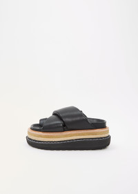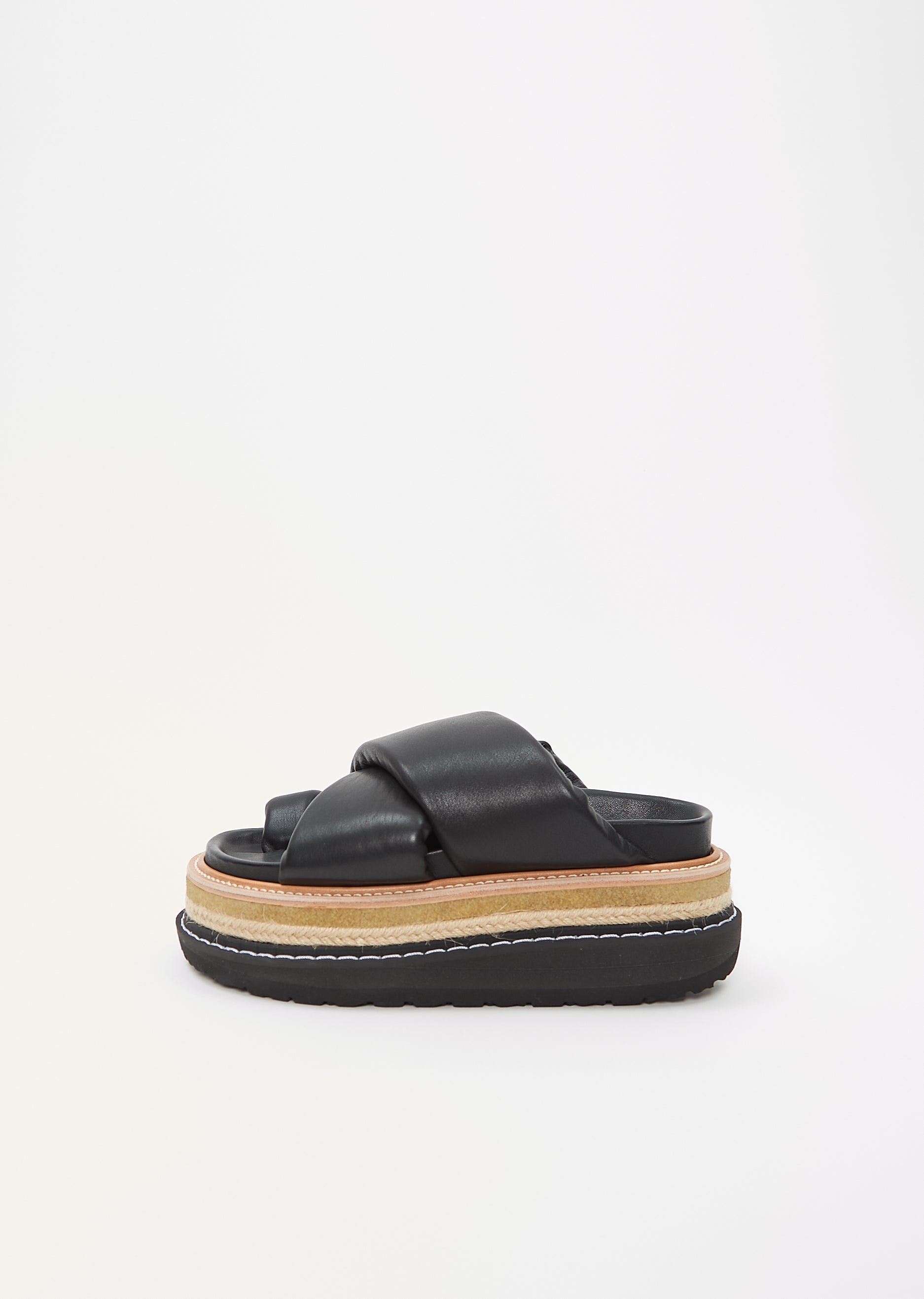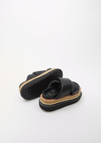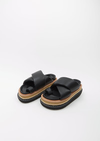 Sacai black slip-on sandal with a layered crepe and jute sole in padded calf leather. Features around open toe, two crossed wide straps, small strap for toe, moulded footbed and a chunky rubber sole. Sizing: European (36-40). Color: Black. Upper: Cowhide. Lining: Cowhide. Sole: 100% Crepe, 100% Jute and 100% Polyethylene Vinyl Acetate. Made in Japan. Made in Japan. PS25SA025