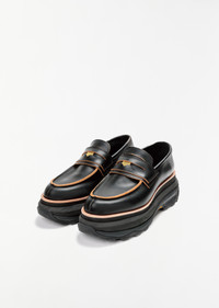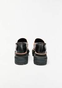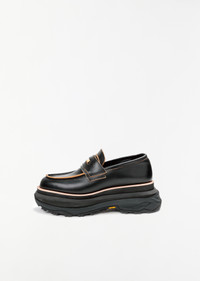 Sacai black loafers with a rounded moc toe and PEVA foam rubber platform in buffed and polished horse leather. Features a wide strap at vamp, tonal topstitching, raw edges, branded gold-tone hardware and a treaded Vibram® rubber sole. Lined in tonal soft leather. Sizing: European (36-40). Platform measures approximately: 3.75 in. Color: Black. Upper: Cowhide. Lining: Horse Leather. Sole: Rubber. Made in Japan. PF25SA004