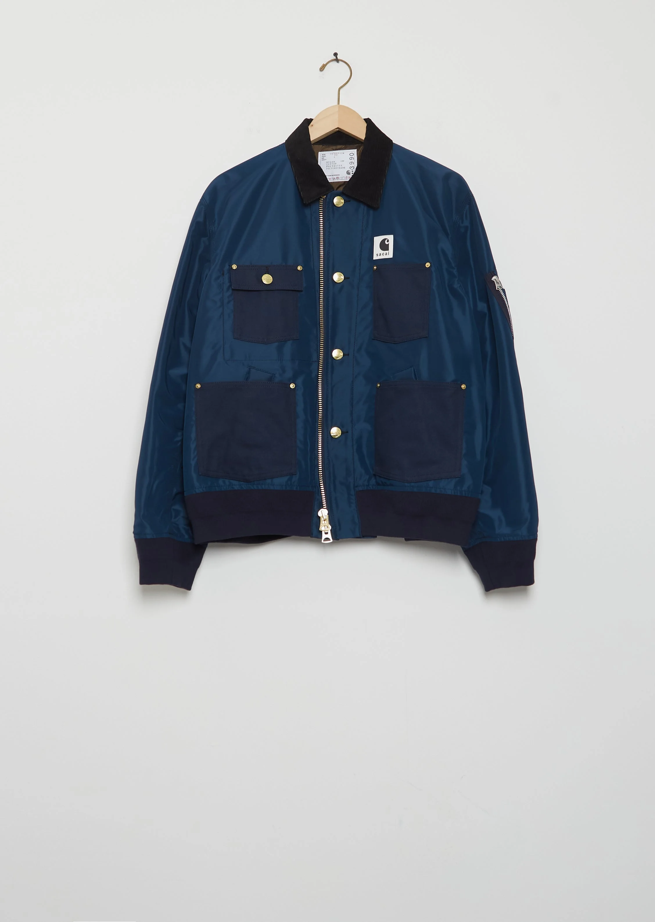 Sacai in collaboration with Carhartt WIP blue jacket with a contrasting corduroy collar and Dearborn Canvas patch pockets in slightly padded signature nylon twill. Features ribbed trim finishings at cuffs and hem, a two-way zipper closure and buttons closure. Finished with tonal stitching, gold-toned hardware throughout and a co-branded woven label. Fully lined in tonal fabric. Sizing: Designer's unique sizing (2 & 3). 2=M, 3=L. Color: Blue. 100% Nylon. Pockets: 100% Cotton. Attached parts: 55% Polyester, 44% Cotton, 1% Polyurethane. Lining: Polyester 20%. Filling: Polyester 100%. Made in Japan. SS26SCW01