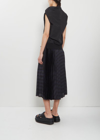 Sacai black pullover sleeveless top with an asymmetric neckline and draped details in crisp and soft cotton blend poplin. Features a side slit and a contrasting ribbed knit trim at hem. Sizing: Designer's unique sizing (1-4). 1=S, 2=M, 3=L, 4=XL. Xian is 5' 9.5” (177cm), bust 30.5”, waist 23”, hips 34.5” and wears a size 1. Color: Black. 65% Polyester, 35% Cotton. Attachments: 50% Cotton, 50% Polyester. Made in Japan. PS26SA018