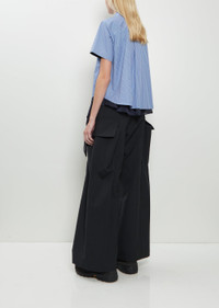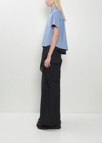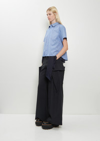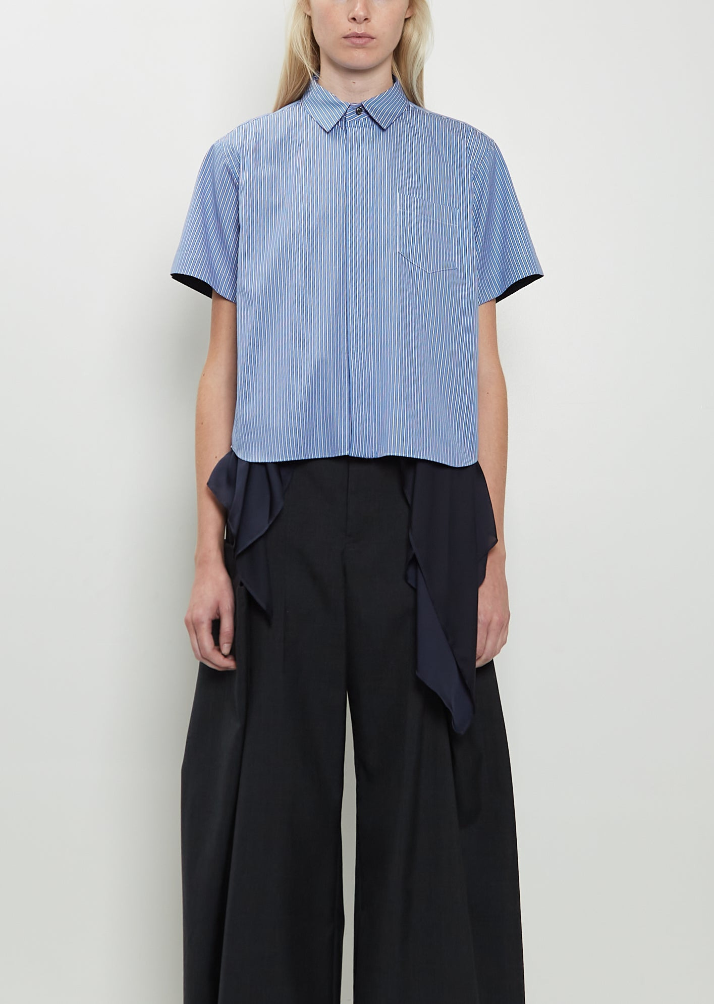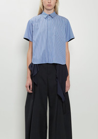 Sacai blue stripe short sleeve shirt with attached satin handkerchief details at hem in cotton poplin. Features a classic collar, chest patch pocket, box pleat at back yoke, and a concealed button placket with single exposed button at neck. Worn with: Wool Suiting Pants and Leather Platform Loafers . Sizing: Designer's unique sizing (1-3). 1=S, 2=M, 3=L. Abigail is 5' 10.5” (179cm) , bust 30”, waist 24”, hips 34” and wears a size 1. Color: Blue Stripe. 100% Cotton, 100% Polyester. Made in Japan. FW25SA010