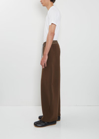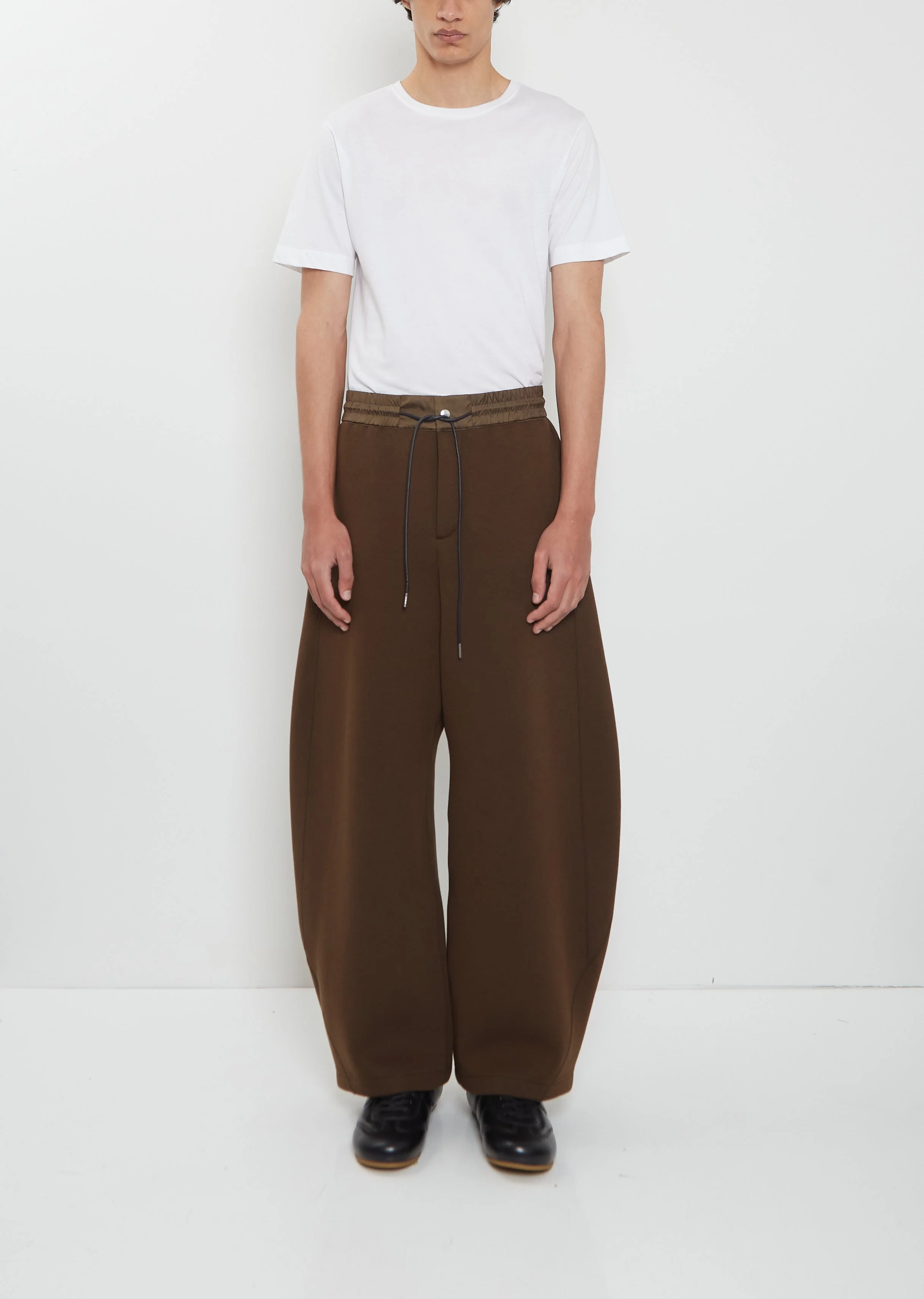 Sacai brown pull-on pants with an elasticated waist and adjustable drawstring in signature sponge jersey sweat fabric. Features a single patch pocket at back and a press button and zip fly fastening. Sizing: Designer's unique sizing (1-3). Stefano is 6'2" (188cm), chest 35”, waist 31”, and wears a size 2. Color: Brown. 62% Cotton, 38% Polyester. Made in Japan. SS26SAM07