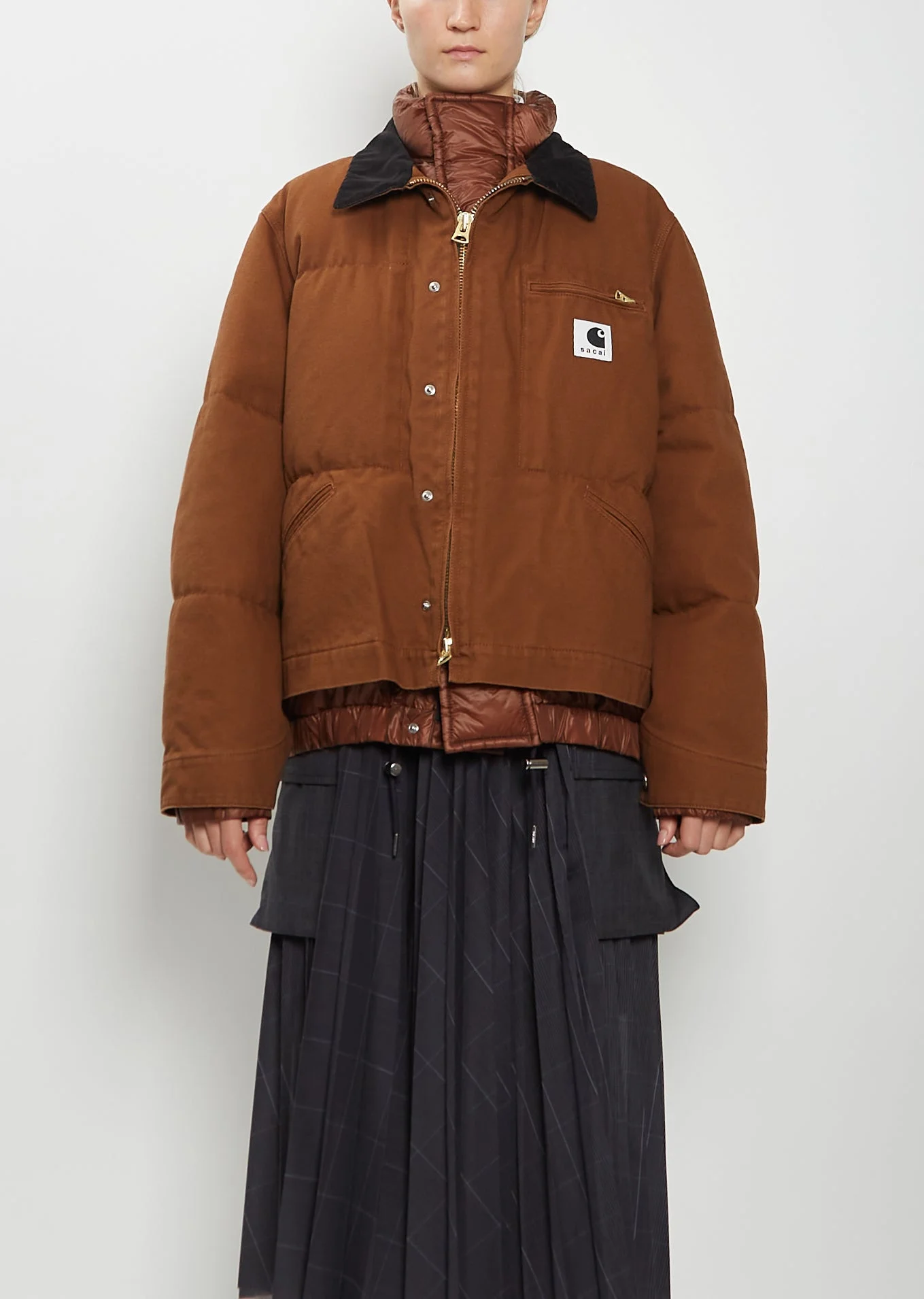 Sacai x Carhartt WIP dark beige duck puffer jacket with a layered construction in garment-washed signature heavyweight cotton canvas. Puffer layer is crafted in high-density nylon taffeta woven with water-repellent threads for airtight protection and filled with down feathers. Features a stand collar, adjustable drawcord hem, press button side seams, elasticated cuffs, an interior velcro pocket, single press button at neck and hem, and concealed double zip front closure. Duck jacket layer features a contrasting corduroy collar, a zippered chest pocket, angled welt pockets, adjustable press button cuffs, press button waist adjusters, and a double zip front closure. Press button front crosses from puffer layer to duck jacket layer. Finished with gold-toned hardware and a branded patch at chest. Also available in: Green. Sizing: Designer's unique sizing (0-4). 0=XS, 1=S, 2=M, 3=L, 4=XL. Alina is 5' 9” (175cm), bust 31”, waist 23", hips 34” and wears a size 1. Color: Dark Beige. 100% Cotton. Attached Parts: 100% Nylon. Filling: 90% Down, 10% Feather. Made in Japan. FW25SCW03
