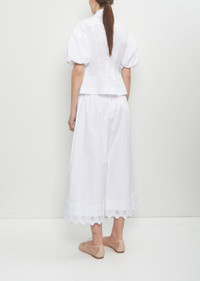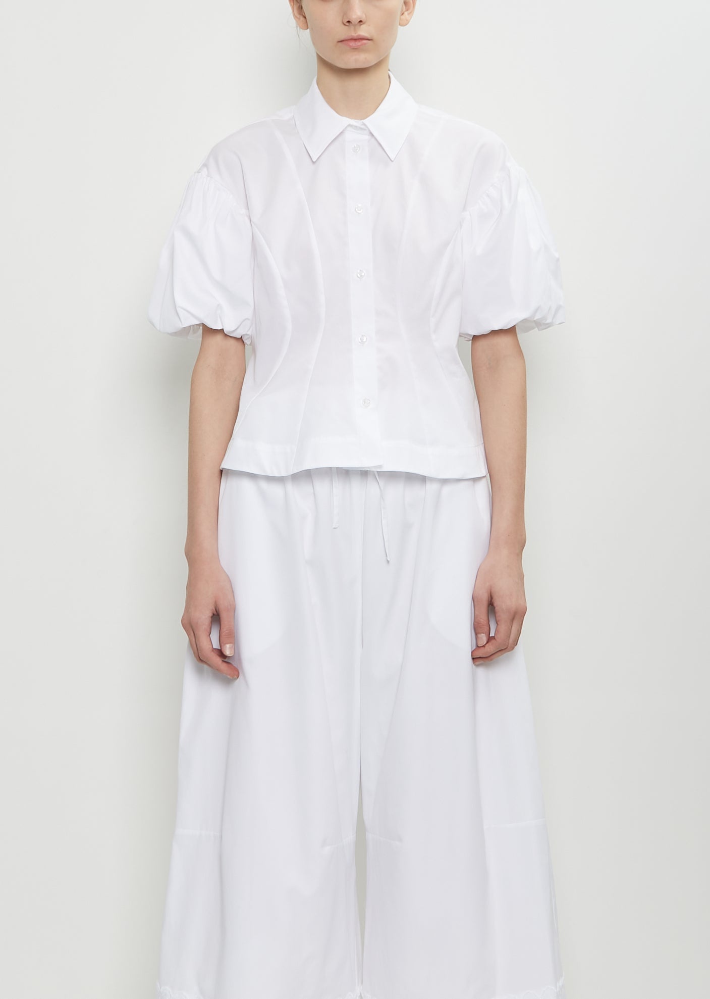 Simone Rocha white cropped shirt with short puffed sleeves in cotton poplin. Features a spread collar, dropped shoulders, princess seams at front for a fitted bodice, darts at back and a shell-hued buttons closure at front. Regular fit. Also available in: Black . Worn with: Cotton Ruffle Waist Cropped Trousers and Embellished Mesh Ballerina. Sizing: UK Sizing (6-12). 6=XS, 8=S, 10=M, 12=L. Amelia is 5' 10.5” (179cm), bust 32”, waist 24”, hips 35” and wears a size 8. Color: White. 100% Cotton. Imported. SS25SR016
