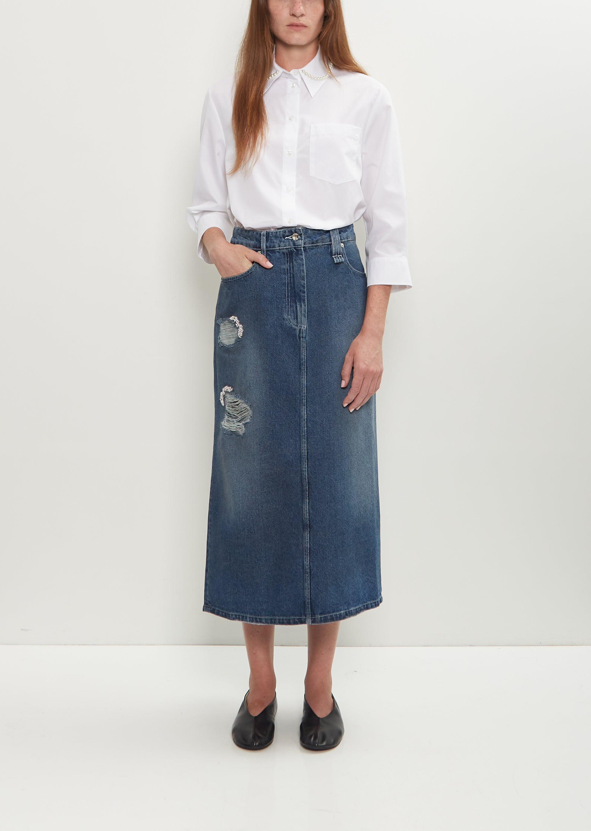 Simone Rocha blue flare skirt with embellished distressed details in mid-weight cotton denim. Features belt loops, 5-pocket construction, an embellished leather detail at back waist, pleats at back and a button and zip-fly fastening. Worn with: Cotton Embellished Cropped Shirt — White and Stella Leather Slipper — Black . Sizing: UK Sizing (6-12). 6=XS, 8=S, 10=M, 12=L. Natalie is 5'10” (178cm), bust 33”, waist 25.5”, hips 35” and wears a 8. Color: Distressed Blue / Pearl / Clear. 100% Cotton. Imported. FW25SR023