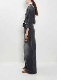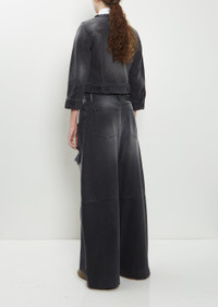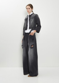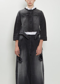 Simone Rocha black collarless jacket with a belt hem detail in cotton denim with a distressed finish. Features black embellishments along front neckline, raw edge finish at neck, buttoned flap chest pockets, buttoned cuffs, buttoned tab waist adjusters at back, and an embellished leather label at back neck. Finished with branded tonal buttons throughout. Sizing: UK Sizing (6-12). 6=XS, 8=S, 10=M, 12=L. Athena is 5'10” (178cm), bust 30”, waist 24.5”, hips 35” and wears a size 8. Color: Distressed Black / Jet. 100% Cotton. Imported. FW25SR028