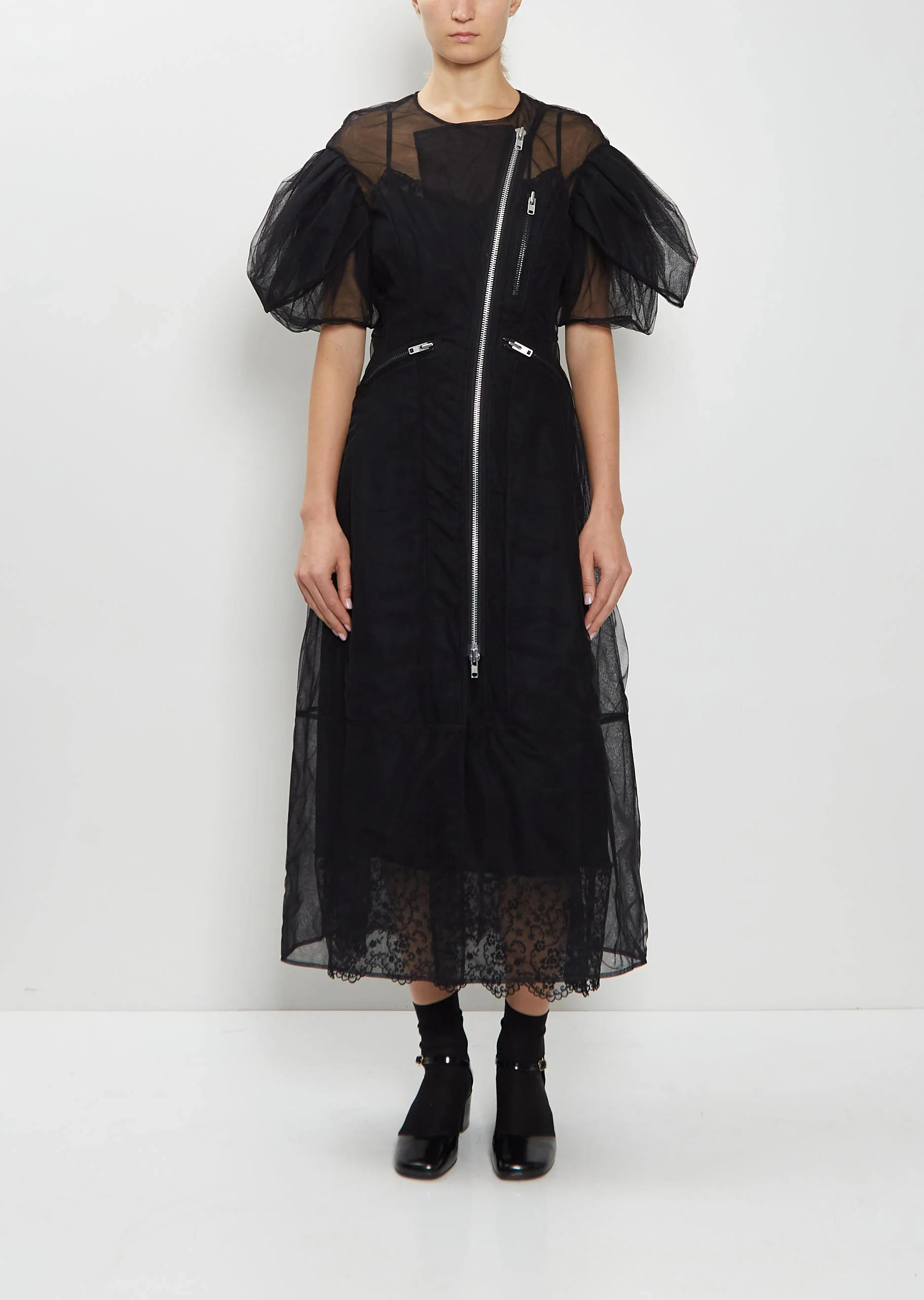 Simone Rocha black dress with an asymmetrical two-way silver-hued zipper front and signature petal puff sleeves in sheer tulle. Features a round neckline, vertical zippered chest pocket, and angled front zippered pockets. Worn with: Slip Dress with Deep Lace Trim — Black and Penelope Ankle Strap Heel — Black . Sizing: UK Sizing (6-12). 6=XS, 8=S, 10=M, 12=L. Alina is 5' 9” (175cm), bust 31”, waist 23", hips 34” and wears a size 8. Color: Black. 100% Polyamide. Imported. FW25SR031