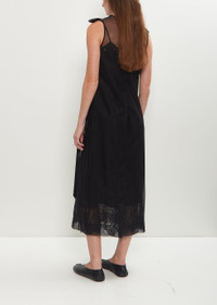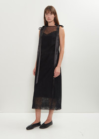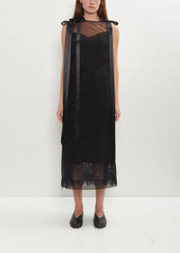 Simone Rocha black pullover straight sleeveless dress with two satin bow details at right shoulder and a single bow at left shoulder in sheer tulle. Features a round neckline, side seam pockets and a slit at center back. Comes unlined. Worn with: Satin Lace Trim Slip Dress and Mesh Ballerina Heel . Sizing: UK Sizing (6-12). 6=XS, 8=S, 10=M, 12=L. Effy is 5'10” (178cm), bust 30.5”, waist 23”, hips 33” and wears a size 8. Color: Black. 100% Nylon. Ribbon: 100% Polyester. Imported. FW25SR027