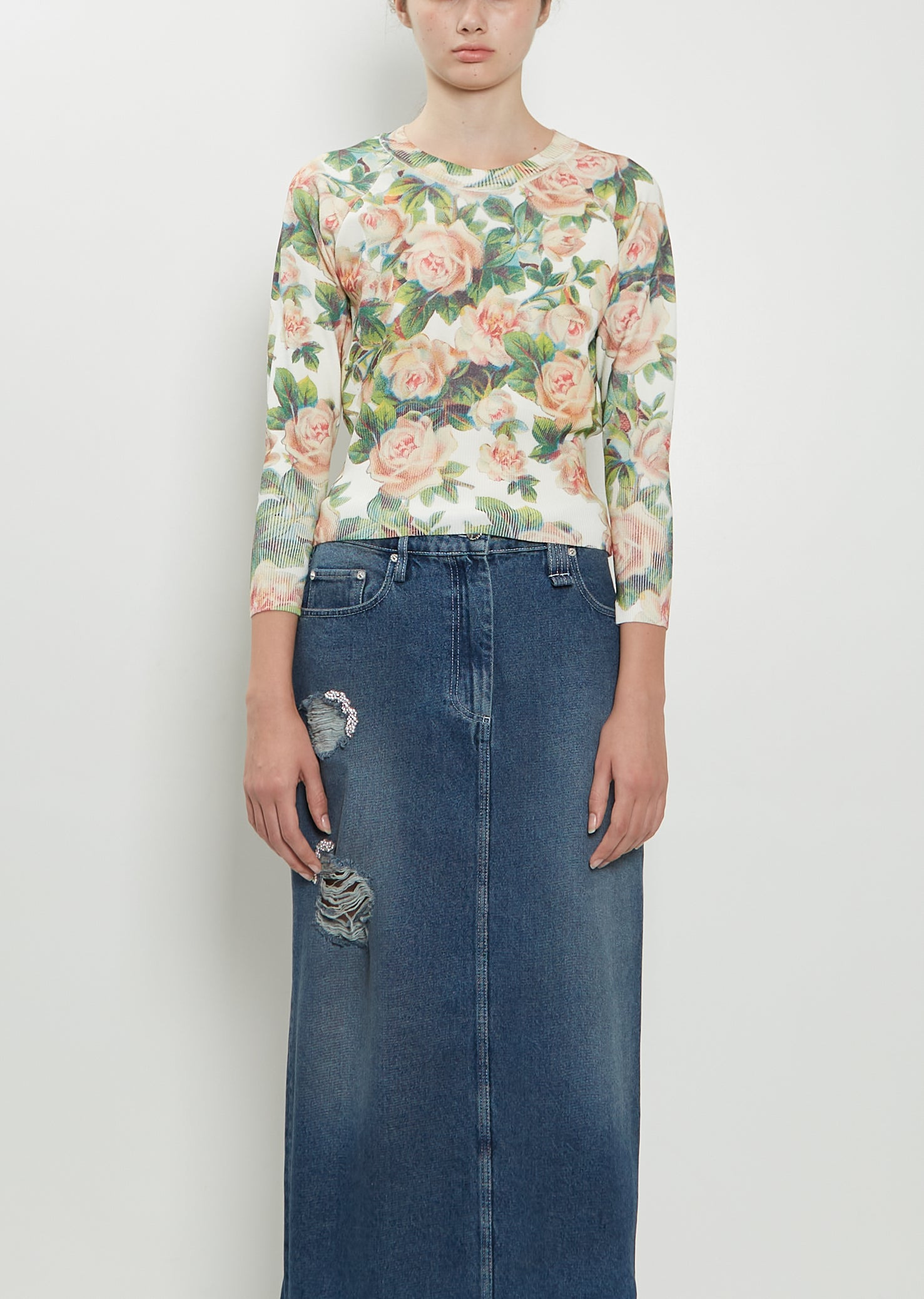 Simone Rocha light pink sweater with a closer fit in lightweight stretch knit with a printed floral motif. Features a round neckline, raglan sleeves, and wide ribbed trim finish at neckline, cuffs, and hem. Sizing: Universal (XS-L). Athena is 5'10” (178cm), bust 30”, waist 24.5”, hips 35” and wears a size small. Color: Rose. 70% Viscose, 30% Stretch Poly. Imported. FW25SR019