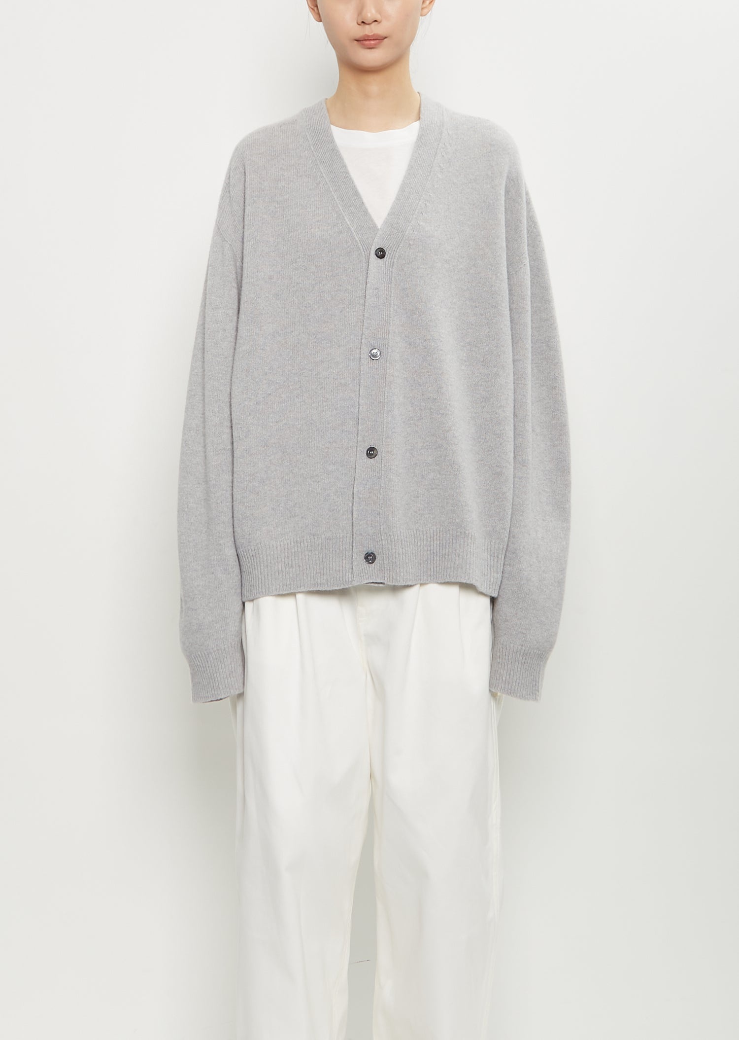 Sofie D'Hoore light grey melange cardigan with a V-neckline and four mother-of-pearl button front in wool knit. Features dropped shoulders and ribbed trim finish at cuffs and hem. Also available in: Slate . Worn with: Toledo Cotton Long Sleeve T-Shirt — Off White , Polke Cotton Loose Pants , and Falk Rainboots . Sizing: Universal (S-L). Effy is 5'10” (178cm), bust 30.5”, waist 23”, hips 33” and wears a size small. Color: Light Grey Melange. 100% Wool. Made in Italy. FW25SD006