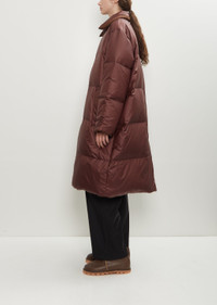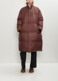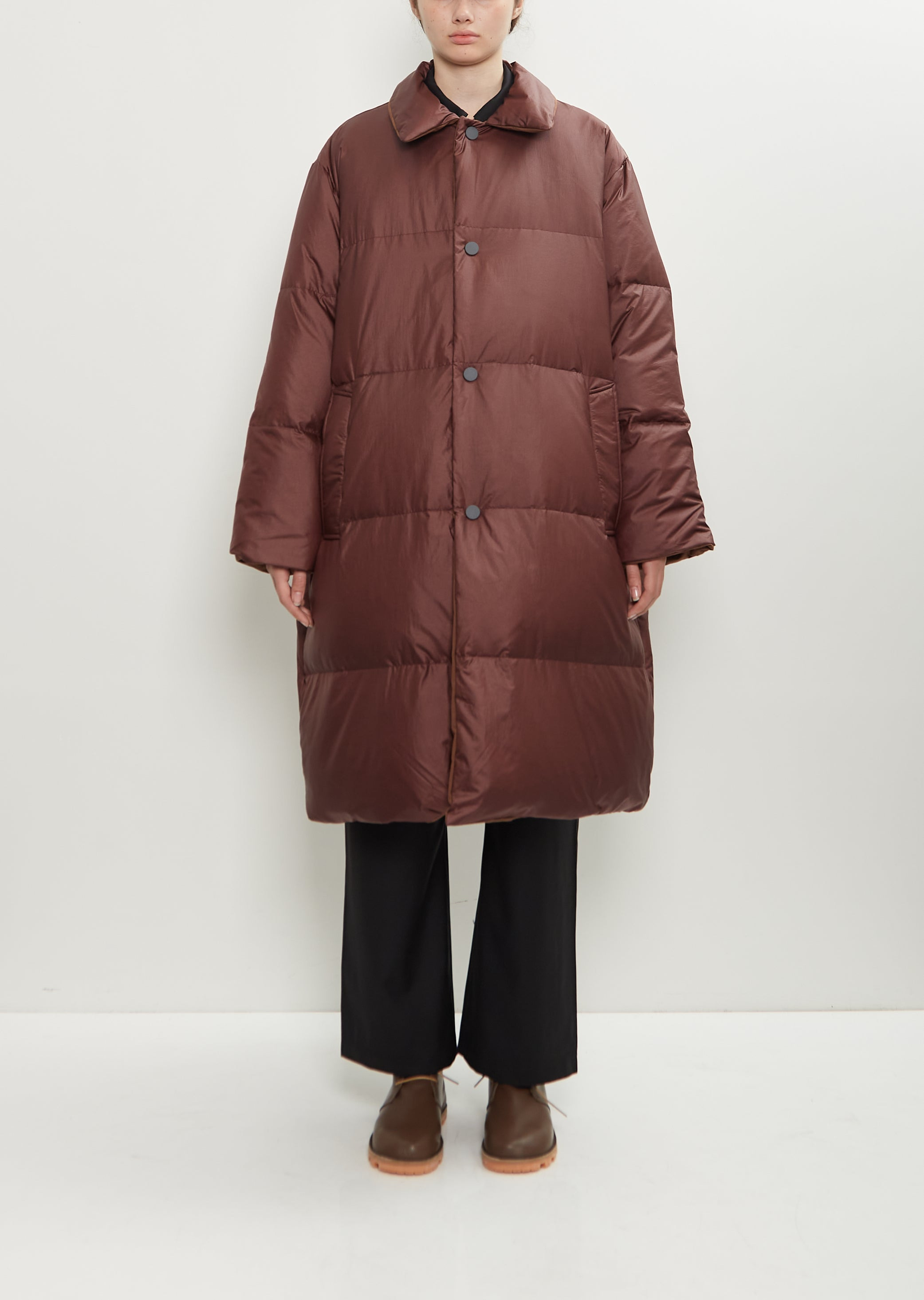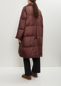 Sofie D'Hoore chestnut burgundy reversible coat with a cotton chocolate brown tone on the other side in technical nylon. Features a classic collar, dropped shoulders, angled front welt pockets on both sides, vent at back, and press button closure. Filled with duck down. Worn with: Cimabue Tropical Wool Jacket , Pinot Tropical Wool Relaxed Pants , and Figari Leather Shoes . Sizing: European (32-40). 32= XXS, 34=XS, 36=S, 38=M, 40=L. Athena is 5'10” (178cm), bust 30”, waist 24.5”, hips 35” and wears a size 36. Color: Chestnut / Chocolate. 100% Cotton, 100% Nylon. Filling: 100% Duck Down. Made in Italy. FW25SD032