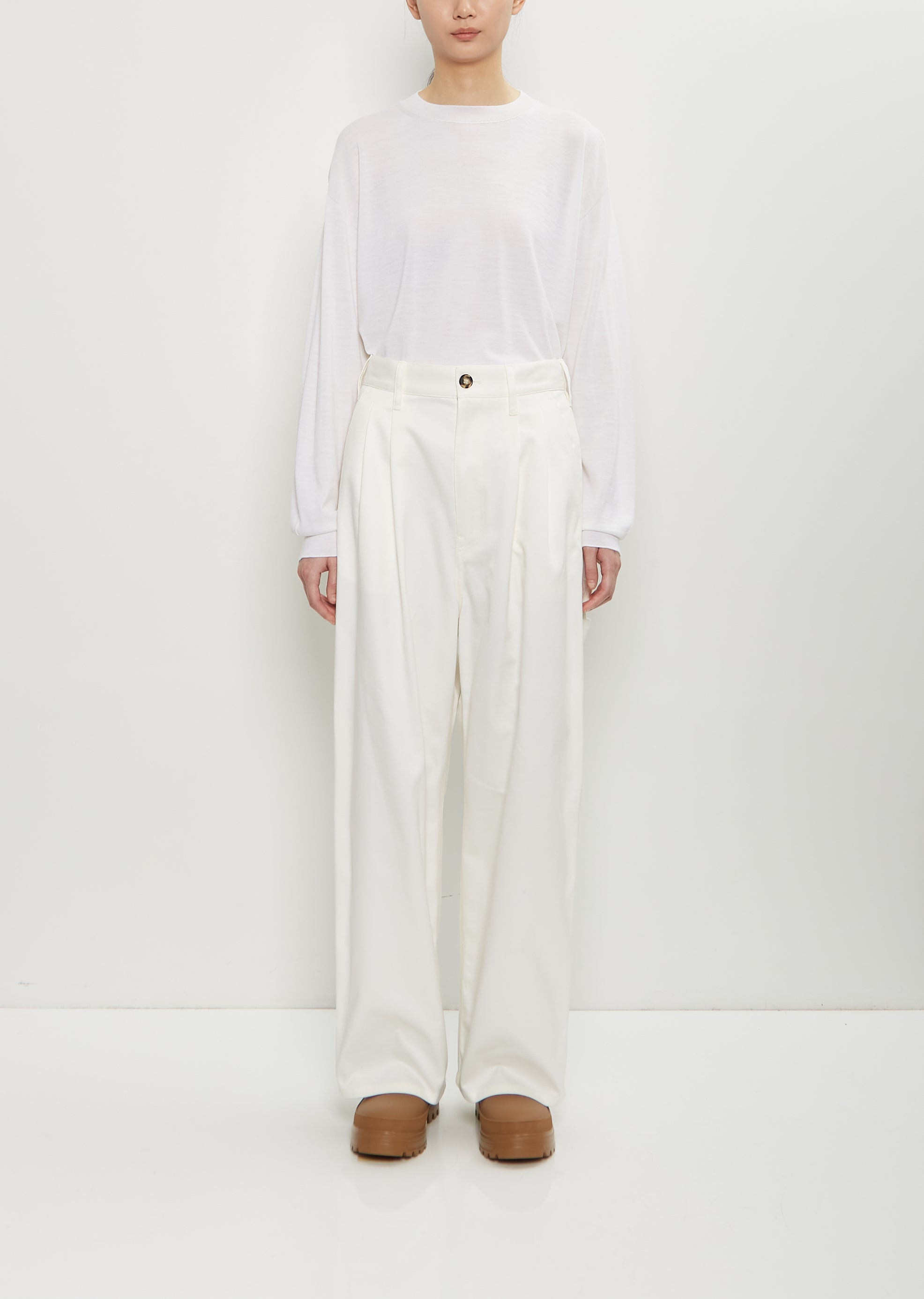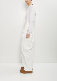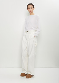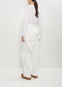Sofie D'Hoore off white cargo pants with wide, straight legs and two front pleats in cotton twill. Features belt loops, angled front pockets, a front coin pocket, patch pockets at back, painter's loop detail, two tool pockets, and a button and zip-fly fastening. Finished with tortoise shell-hued buttons. Relaxed fit. Worn with: Muscat Wool Crewneck Pullover — Off White and Falk Rainboots . Sizing: European (32-40). 32= XXS, 34=XS, 36=S, 38=M, 40=L. Effy is 5'10” (178cm), bust 30.5”, waist 23”, hips 33” and wears a size 34. Color: Off White. 100% Cotton. Imported. FW25SD040