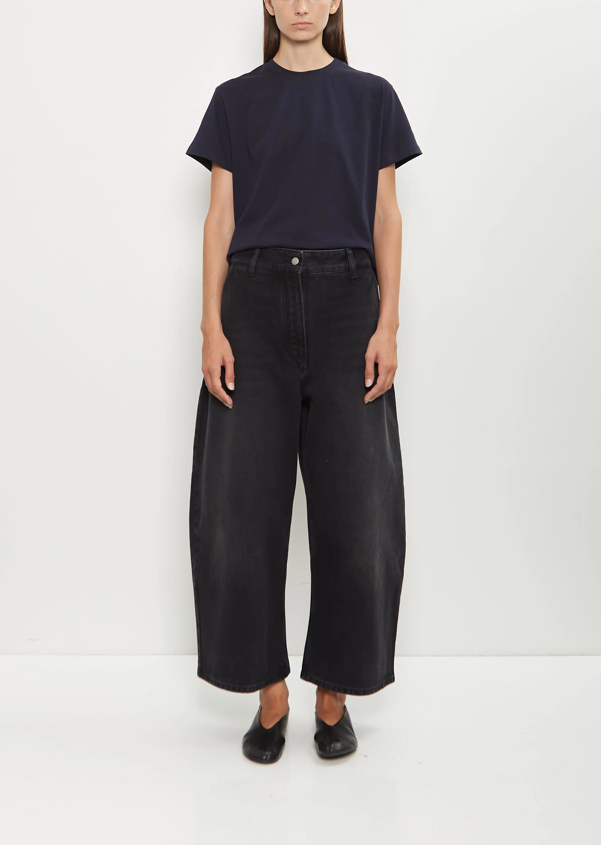 Studio Nicholson washed black slightly cropped, volume pant with a high rise fit and wide legs in signature crisp Italian cotton denim with a worn and washed effect. Features a clean front, side slip pockets, back patch pockets, contrasting tobacco stitching and a concealed zip with button closure. Worn with: Marine Cotton Tee — Darkest Navy and Stella Leather Slipper — Black . Sizing: UK Sizing (6-12). 6=XS, 8=S, 10=M, 12=L. Amelia is 5' 10.5” (179cm), bust 32”, waist 24”, hips 35” and wears a size 6. Color: Washed Black. 52% Regenerative Cotton 48% Cotton. Imported. FW25SN012