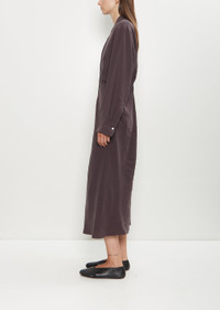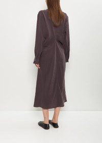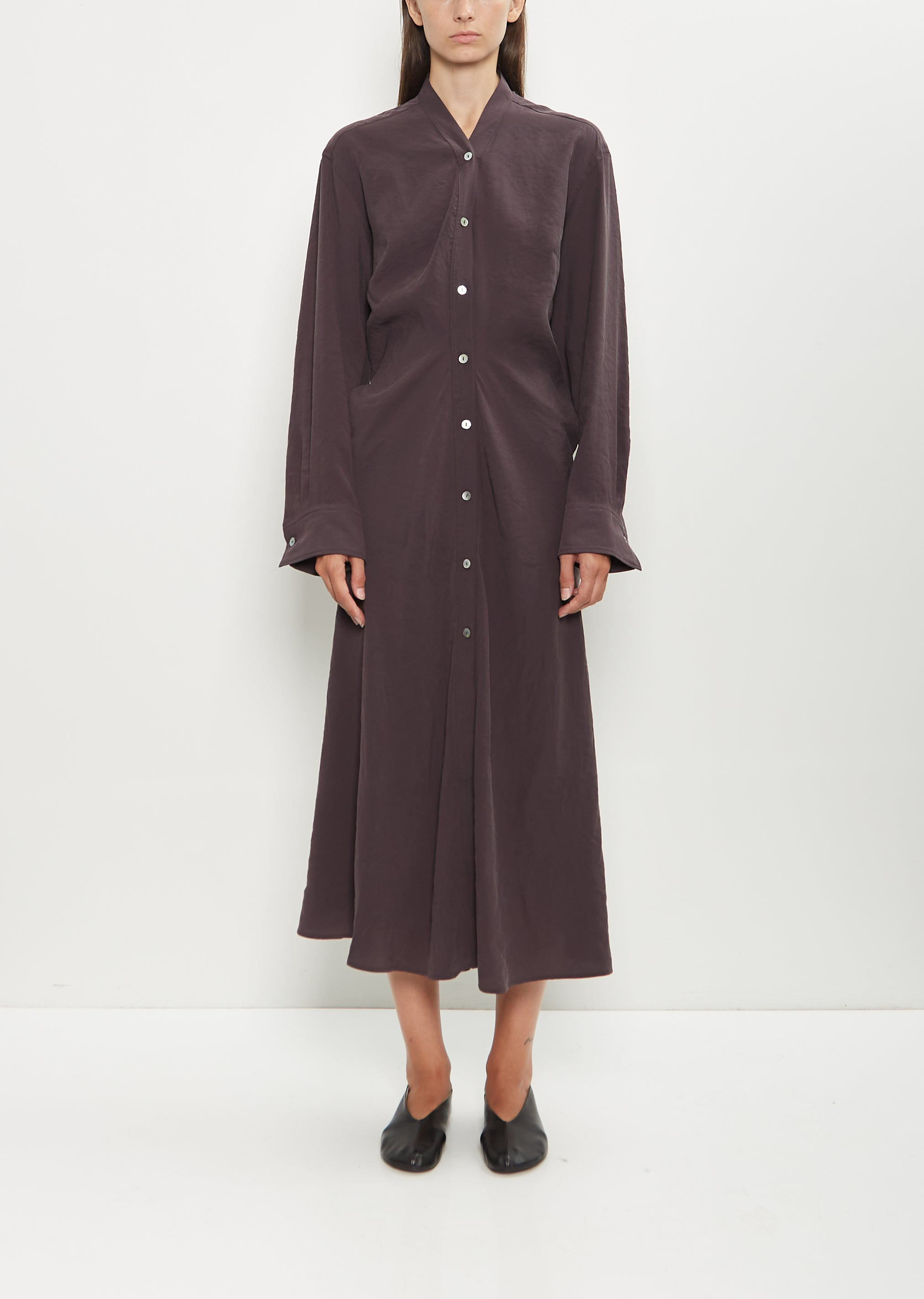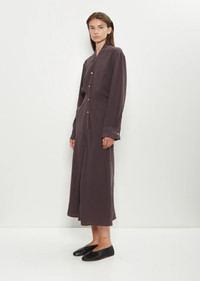Studio Nicholson brown dress with a rumpled effect at front and back bodice in a fluid and soft modal blend twill. Features a V-neckline, slightly dropped shoulders, buttoned cuffs and a shell-hued buttons closure at front. Relaxed fit. Sizing: UK Sizing (6-12). 6=XS, 8=S, 10=M, 12=L. Amelia is 5' 10.5” (179cm), bust 32”, waist 24”, hips 35” and wears a size 8. Color: Yam. 85% Modal FCS, 15% Polyester. Imported. PF25SN009