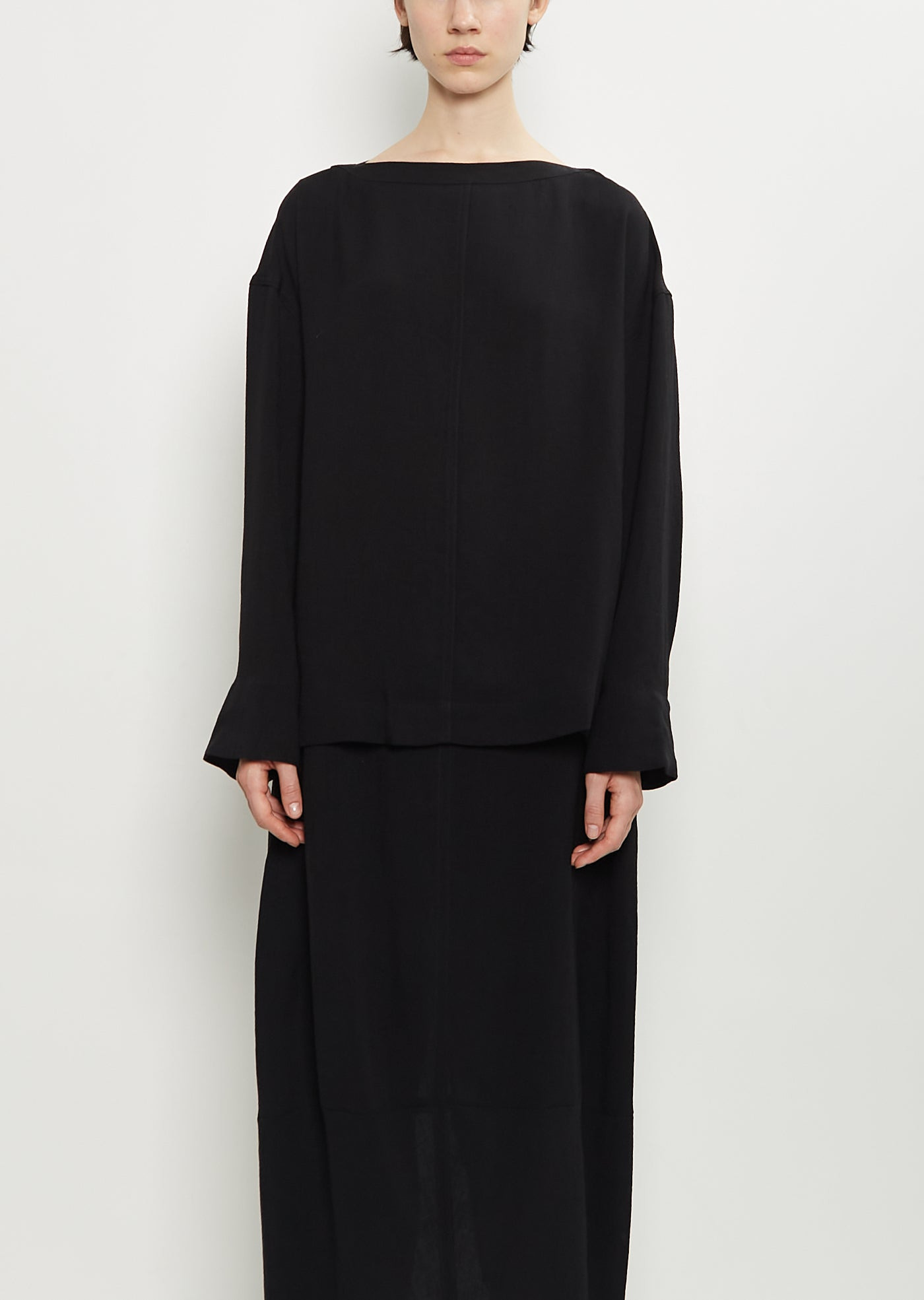 Studio Nicholson black blouse with a boat neckline and center seam detail in lightweight and fluid triacetate twill. Features dropped shoulders and a button fastening at back neck. Boxy fit. Sizing: UK Sizing (6-12). 6=XS, 8=S, 10=M, 12=L. Mila is 5' 9.5” (177cm) , bust 30”, waist 24”, hips 35” and wears a size 8. Color: Black. 100% Triacetate. Imported. FW25SN009