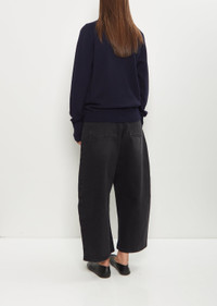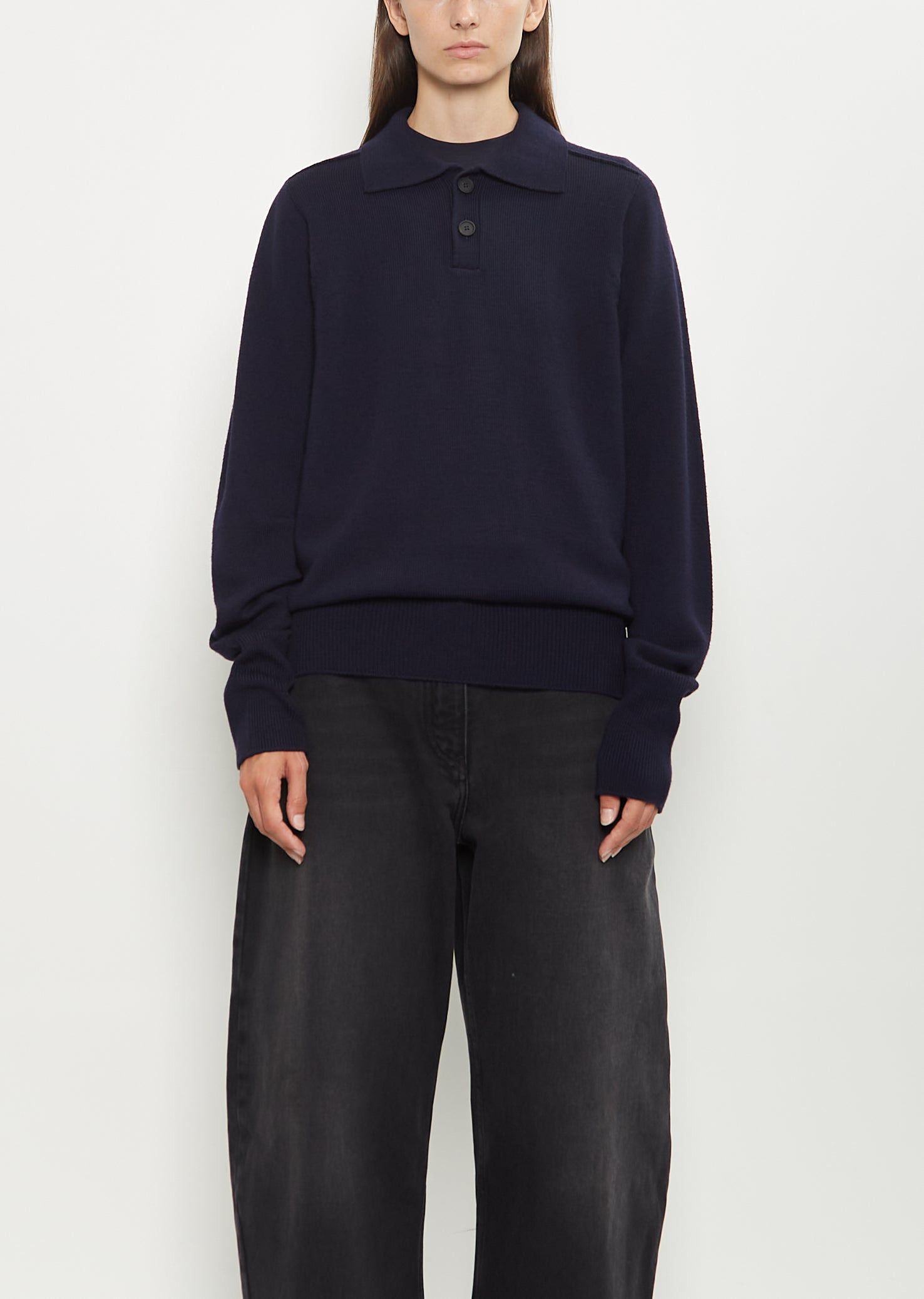 Studio Nicholson navy long sleeve polo sweater with a spread collar and a black two buttons closure at neck in extrafine mid-weight merino wool knit. Features set in shoulders and rib knit finishings at elongated cuffs and hem. Relaxed fit. Sizing: Universal (XXS-L). Amelia is 5' 10.5” (179cm), bust 32”, waist 24”, hips 35” and wears a size small. Color: Navy. 100% Extrafine Merino Wool. Made in Great Britain. PF25SN007