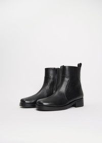 Studio Nicholson black paneled boot with a square toe and concealed silver-hued side zipper closure in smooth Italian calf leather. Features a stacked heel and a sturdy Vibram sole. Sizing: European (36-41). Color: Black. Upper: 100% Leather. Made in Portugal. FW25SN002