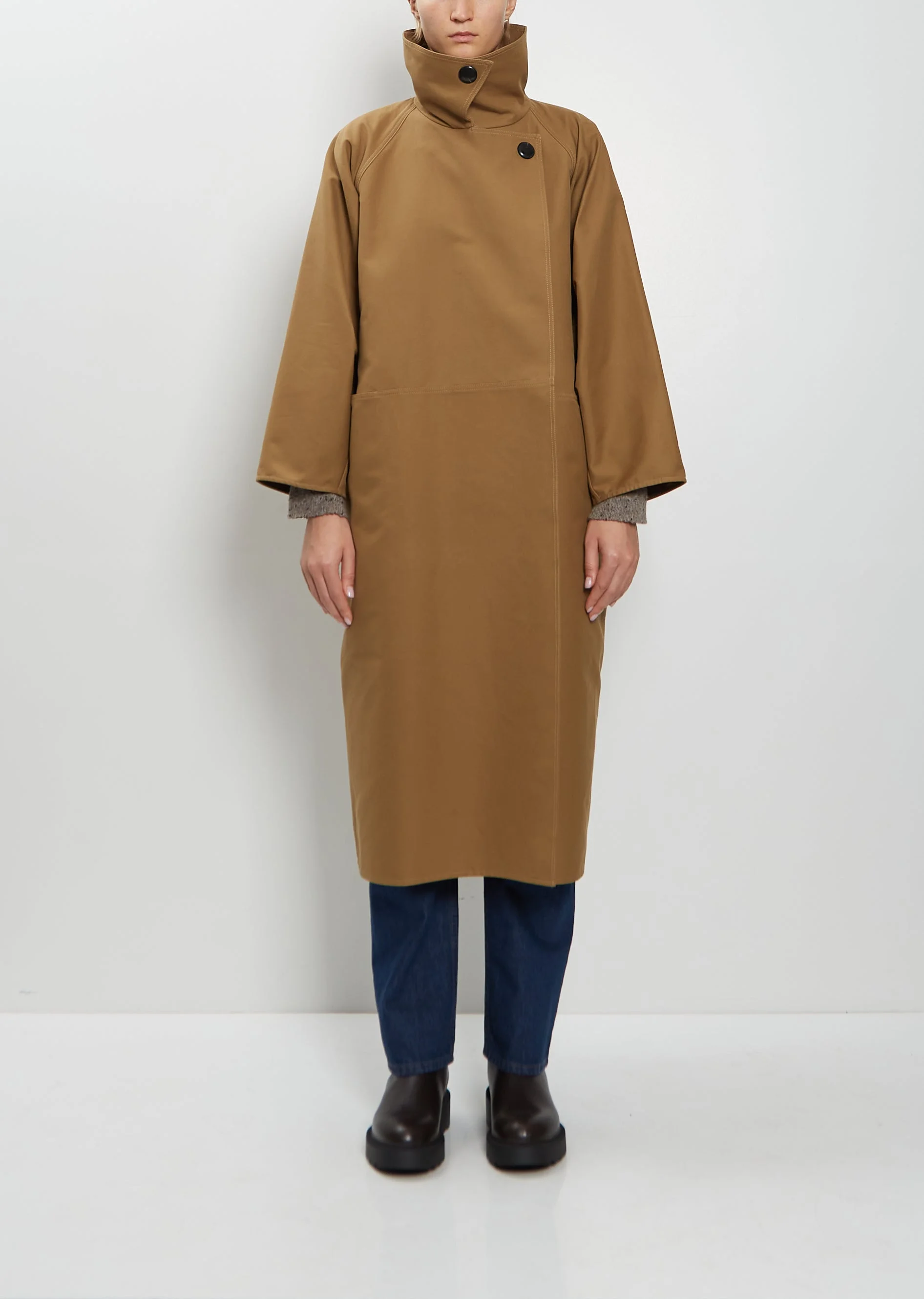 The Row dark beige trench coat with an asymmetrical press button front and optional press button stand collar in cotton. Features raglan sleeves, top slip pockets, underarm vents, angled pleats at back, stitched belt detail at back, and vent at back. Press buttons finished with smooth horn. Comes unlined. Sizing: US Women's (0-8). Alina is 5' 9” (175cm), bust 31”, waist 23", hips 34” and wears a size 2. Color: Moss Green. 100% Cotton. Made in Italy. PS26TR010
