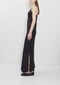 The Row black slip dress trimmed with delicate lace at V-neckline in smooth and luxurious silk. Features thin shoulder straps and high slits at sides. Closer fit at waist. Worn with: Elastic Leather Ballet Slipper — Black Sizing: US Women's (0-8). Color: Black. 100% Silk. Attachments: 60% Viscose, 40% Polyamide. Made in Italy.