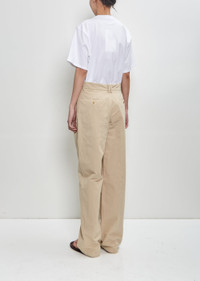 The Row light khaki tailored high-rise pants with wide, straight legs in lightweight cotton and linen blend twill. Features pleats at front, belt loops, side welt pockets, darts at back waist, buttoned welt pockets at back and hooks and zip-fly fastening. Sizing: US Women's (0-6). Danelya is 5' 9.5” (177cm), bust 30.5”, waist 22.5”, hips 34.5” and wears a size 0. Color: Light Khaki. 75% Cotton, 25% Linen, Lining: 100% Cotton. Made in Italy. SS25TR042