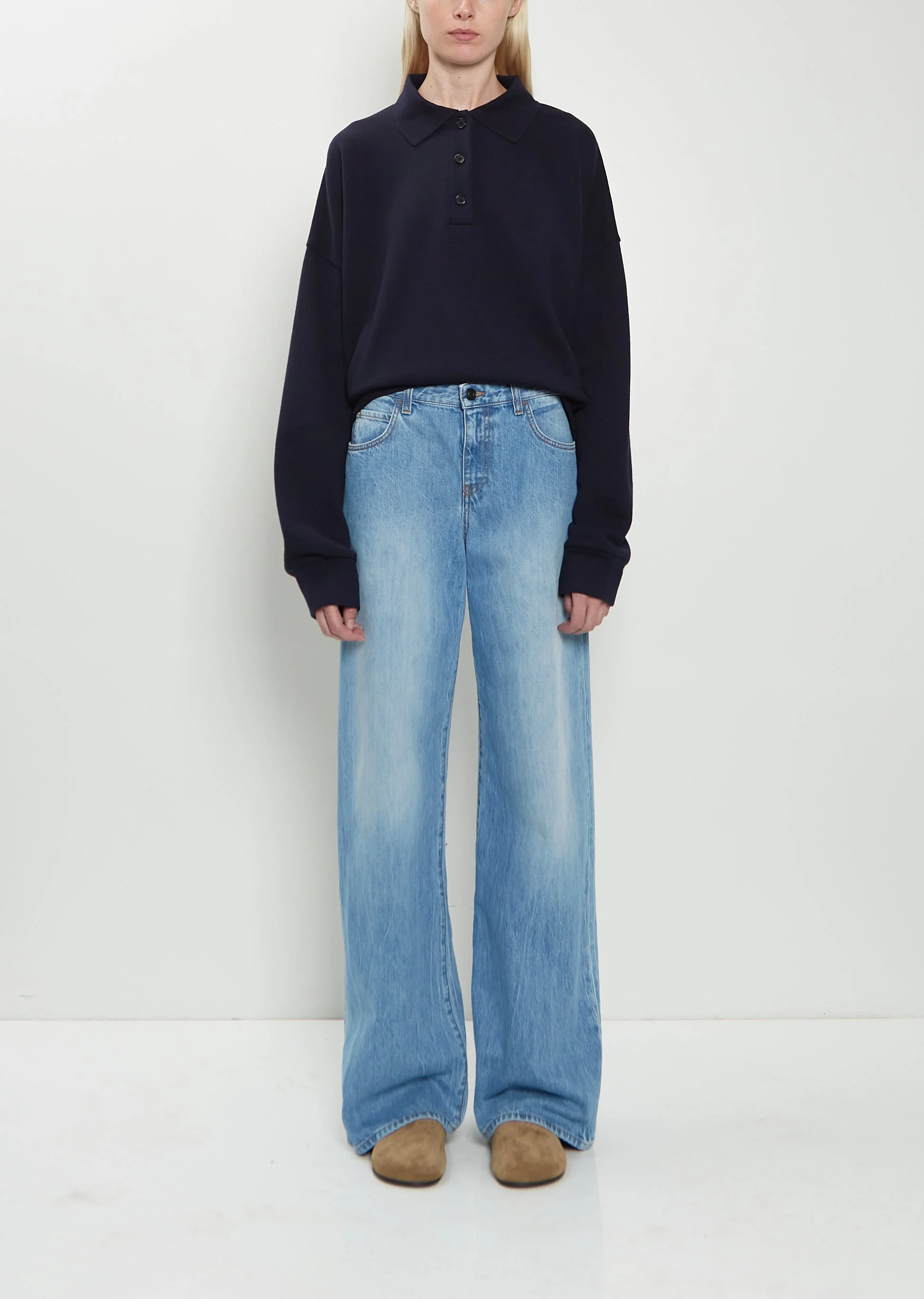 The Essentials Collection — The Row blue low-rise jean with wide, straight legs and a classic 5-pocket construction in stone washed cotton denim. Features tonal topstitching, belt loops and button and zip-fly closure. Relaxed fit. Also available in: Black. Sizing: Waist (24-27). Abigail is 5' 10.5” (179cm) , bust 30”, waist 24”, hips 34” and wears a size 26. Color: Blue. 100% Cotton. 100% Cotton. Lining: 65% Polyester, 35% Cotton. Made in Italy. PS26TRE01