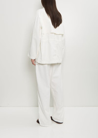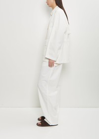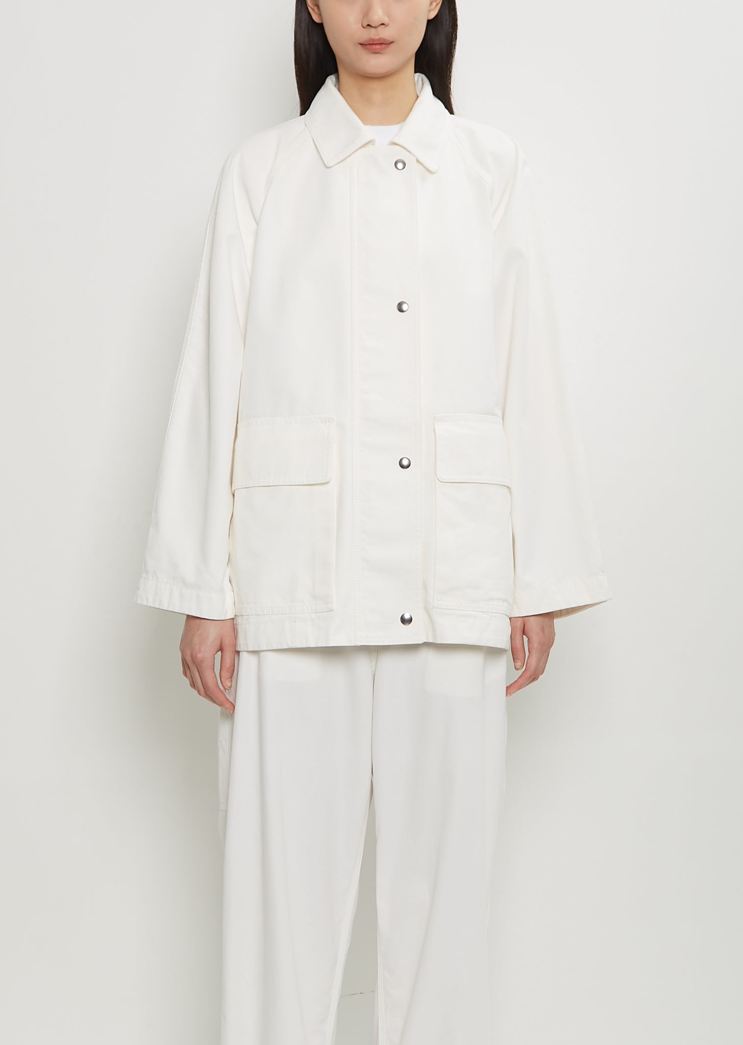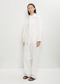 The Row red barn jacket with a concealed press buttons and double zip front closure in washed Japanese cotton canvas. Features raglan sleeves, front flap patch pockets with side opening, a storm flap at back, and a gathered detail at center back. Also available in: Red . Worn with: Karpa Cotton Top , Sharka Cotton Cashmere Pant , and Hugh Slide — Laquer Brown . Sizing: US Women's (0-6). Effy is 5'10” (178cm), bust 30.5”, waist 23”, hips 33” and wears a size 2. Color: White. 100% Cotton. Made in Italy. PF25TR028