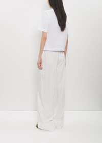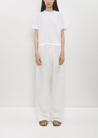 The Row off white pull-on pant with a natural waist and wide legs in airy and lightweight cotton voile. Features a gathered drawstring waistband, side seam pockets and a wide topstitched hem. Relaxed fit. Wide-leg pant in lightweight cotton voile with gathered drawstring waistband, side seam pockets, and wide, topstitched hem. Worn with: Karpa Cotton Top and Hugh Slide — Military . Sizing: US Women's (0-6). Mingyi is 5'11” (180 cm), bust 31”, waist 23”, hips 35” and wears a size 2. Color: Off White. 100% Cotton. Made in Italy. PF25TR033