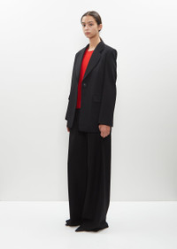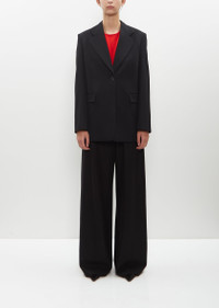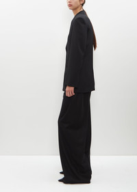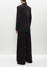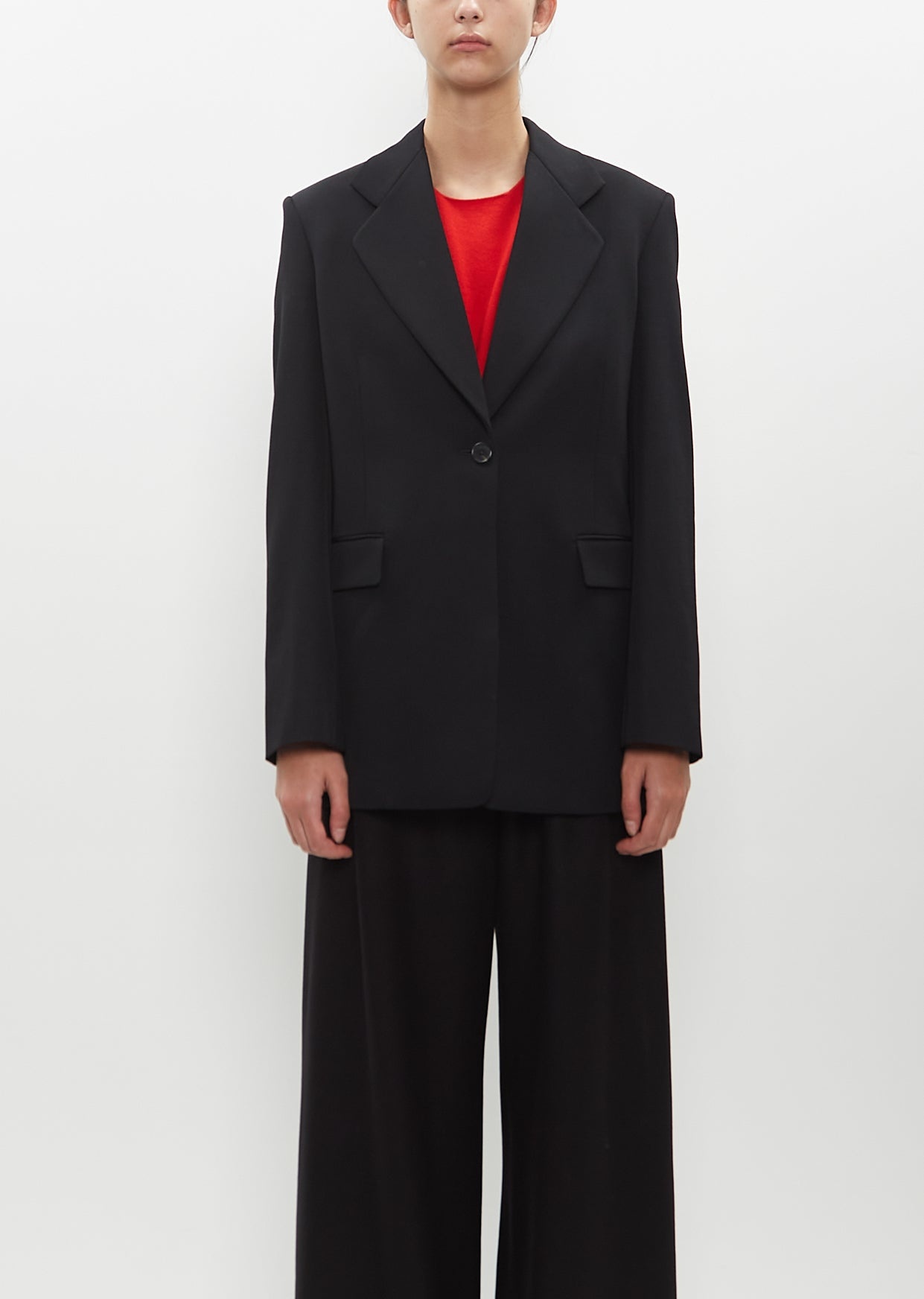 The Row single-breasted blazer with notched lapels in soft fluid wool. Features structured shoulders, flap pockets, a slit at center back, darts at front, a single interior chest pocket and a single horn button closure. Fully lined in tonal silk habotai. Straight fit. Sizing: US (0-6). Delphine is 5’9” (175cm), bust 32", waist 24", hips 35" and wears a size 2. Color: Black. 100% Sheep Wool. Made in Italy. PS25TR011