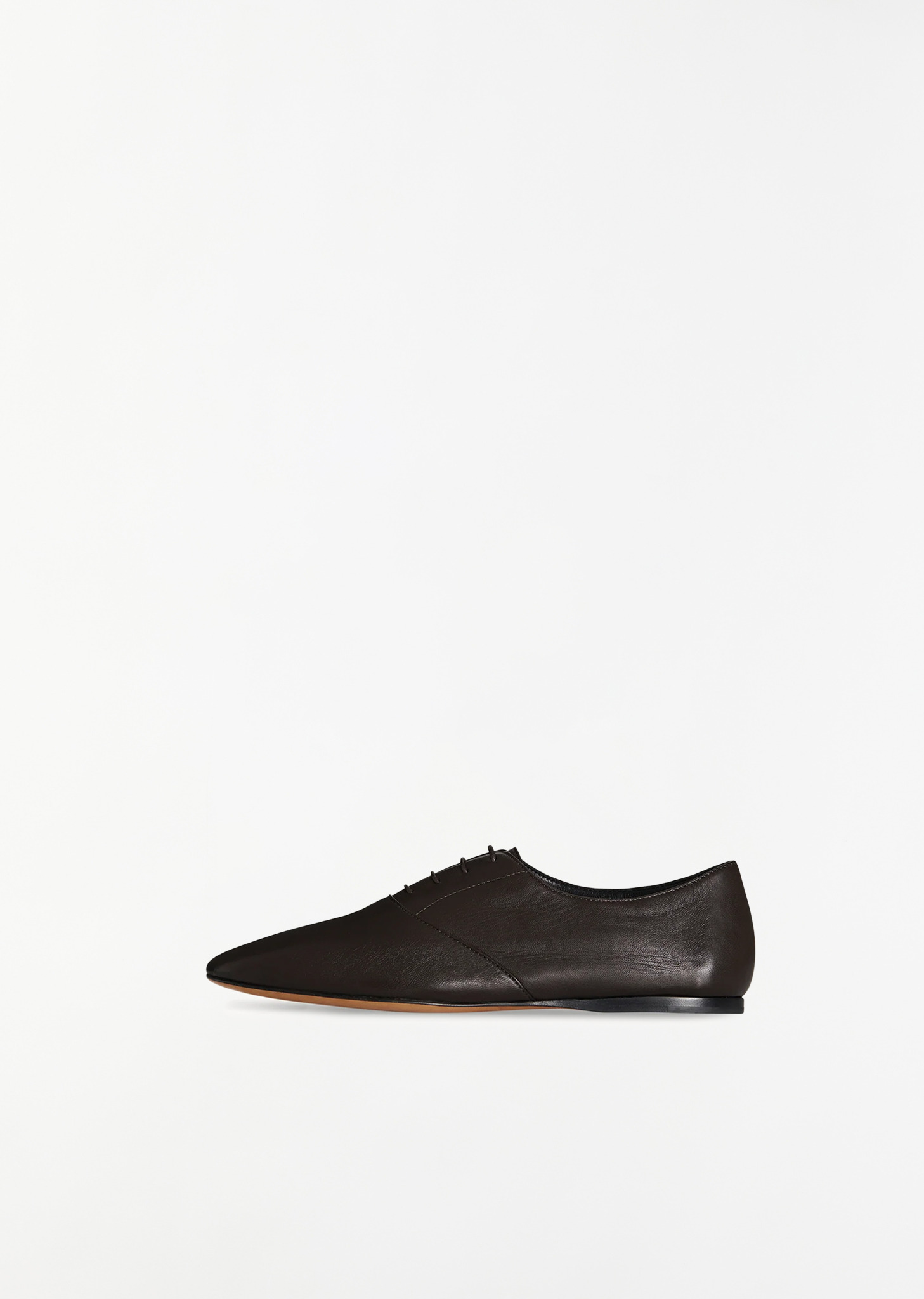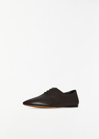 The Row brown minimal lace-up oxford shoe with elongated almond toe and waxed cotton laces in smooth nappa leather. Also available in: Black. Sizing: European (36-41). Color: Laquer Brown. Upper: 100% Smooth Nappa Leather. Made in Italy. PS25TR028