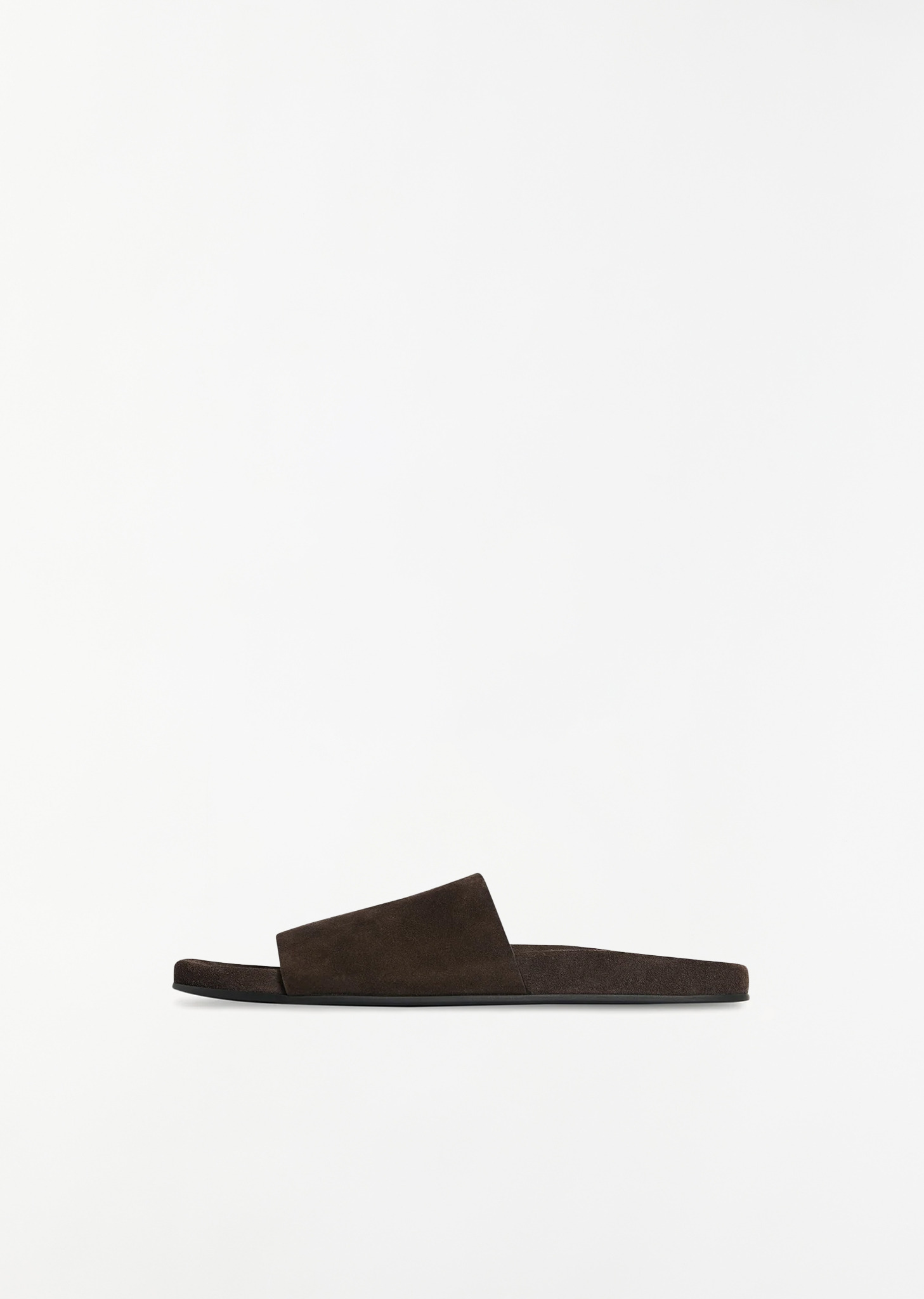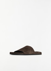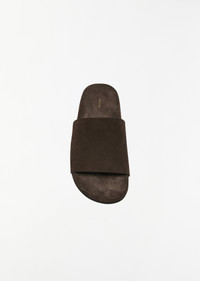 The Row dark brown slide with a rounded toe and contoured footbed in soft calfskin suede. Finished with a rubber sole. Also available in: Military and Black . Sizing: European (36-41). Color: Black. 100% Suede. Made in Italy. PF25TR062