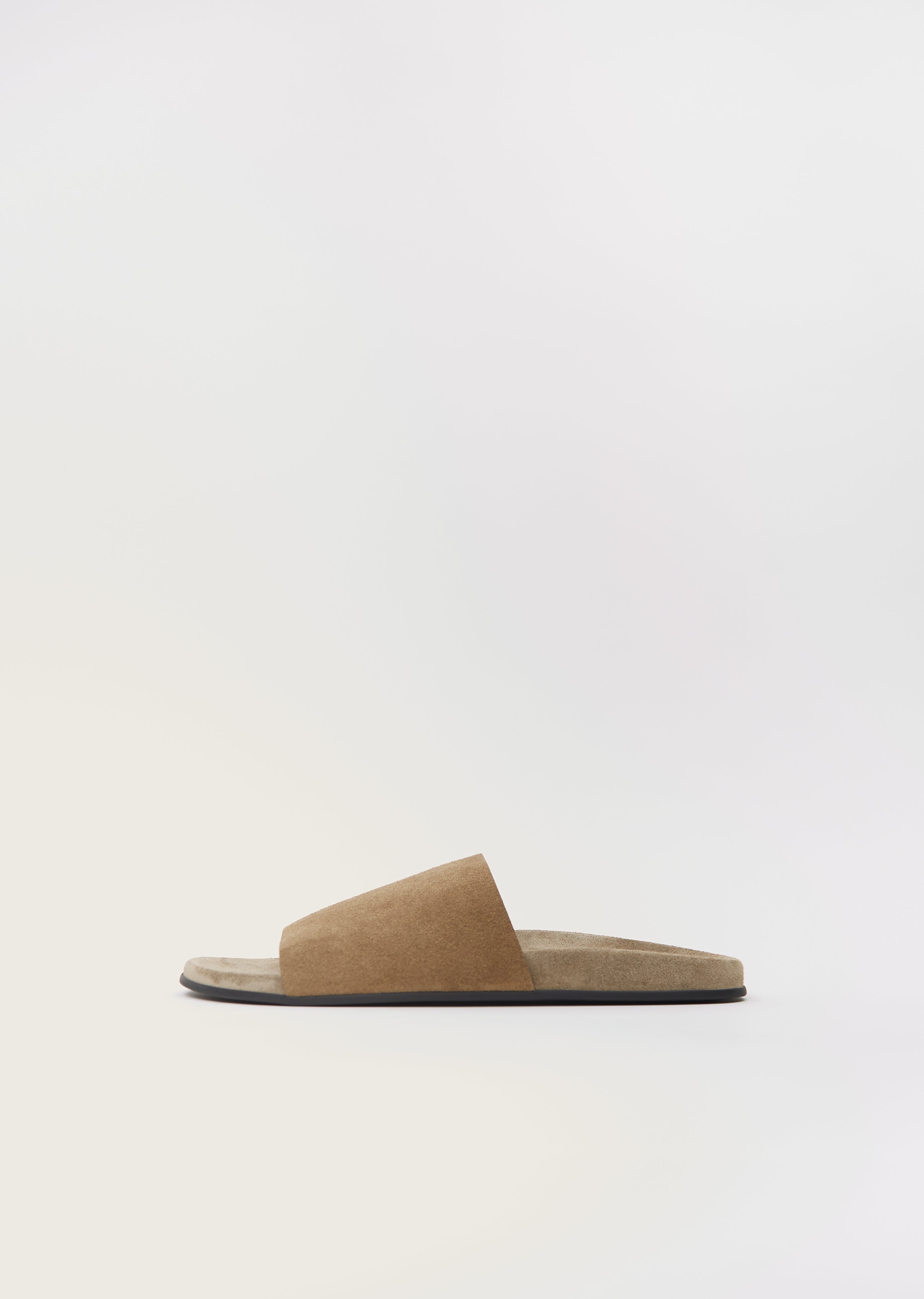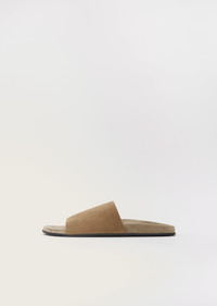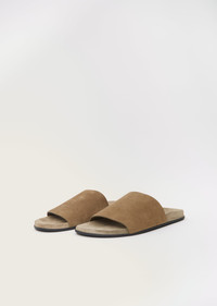 The Row military green slide with a rounded toe and contoured footbed in soft calfskin suede. Finished with a rubber sole. Sizing: European (36-41). Color: Military. 100% Calfskin Suede. Made in Italy. PF25TR063