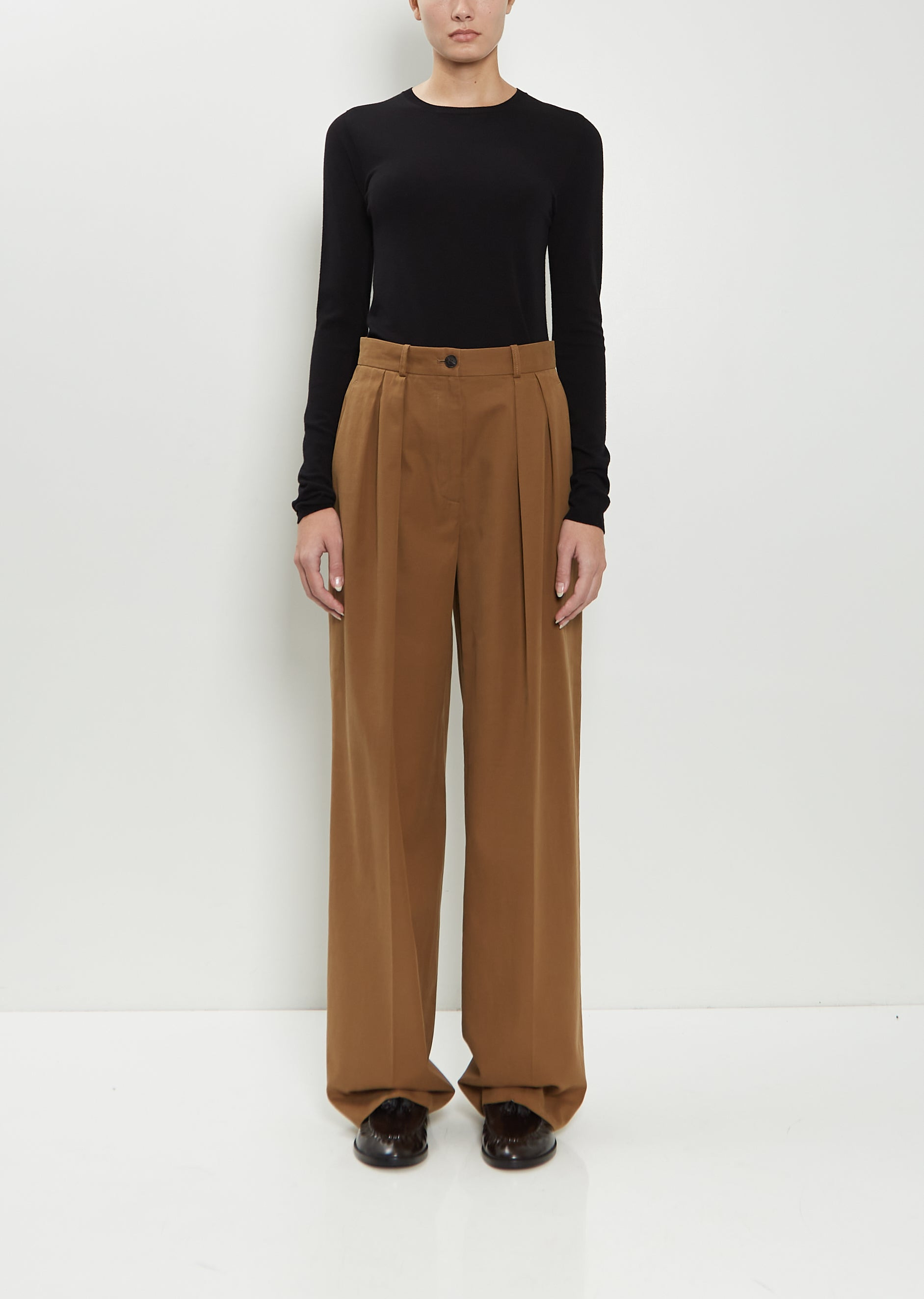 The Row dark sand low-rise trouser with wide, straight legs and two front pleats in cotton cashmere gabardine. Features belt loops, angled front pockets, darts at back, and a button and zip-fly fastening. Sizing: US Women's (0-8). Lais is 5' 9.” (175cm), bust 30.5”, waist 23.5”, hips 35” and wears a size 2. Color: Dark Sand. 95% Cotton, 5% Goat Cashmere. Made in Italy. FW25TR038