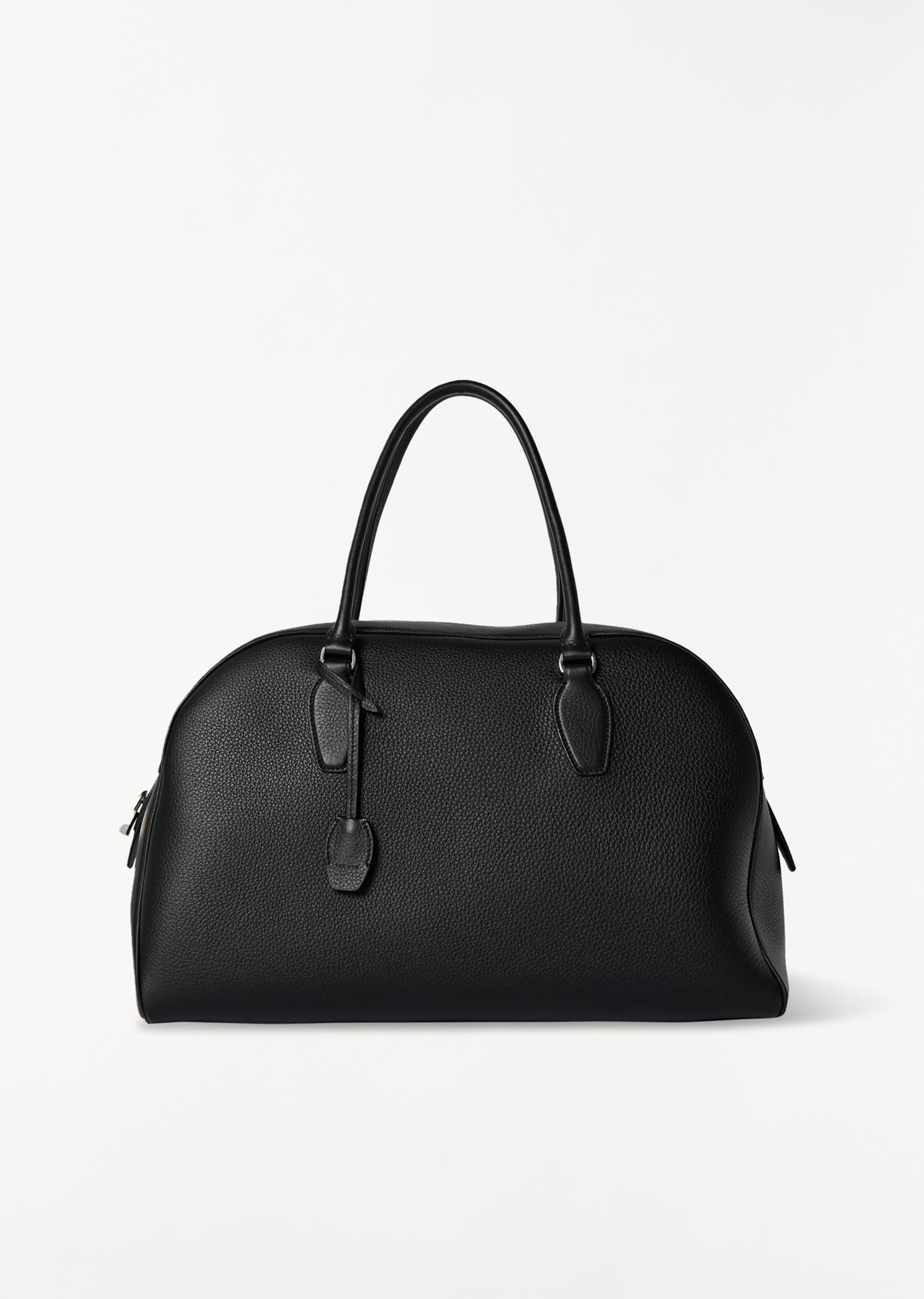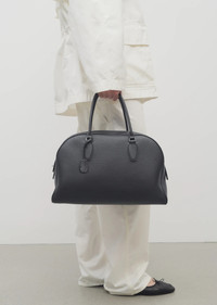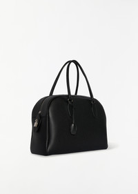 The Row black bowling bag with branded metal padlock and key in lux grain leather. Features tubular handles and a top silver-toned zipper closure. Measures approximately: 15.3 W x 10 H x 5.5 D in. Handle drop: 7.1 in. Color: Black. 100% Lux Grain Leather. Made in Italy. PF25TR011