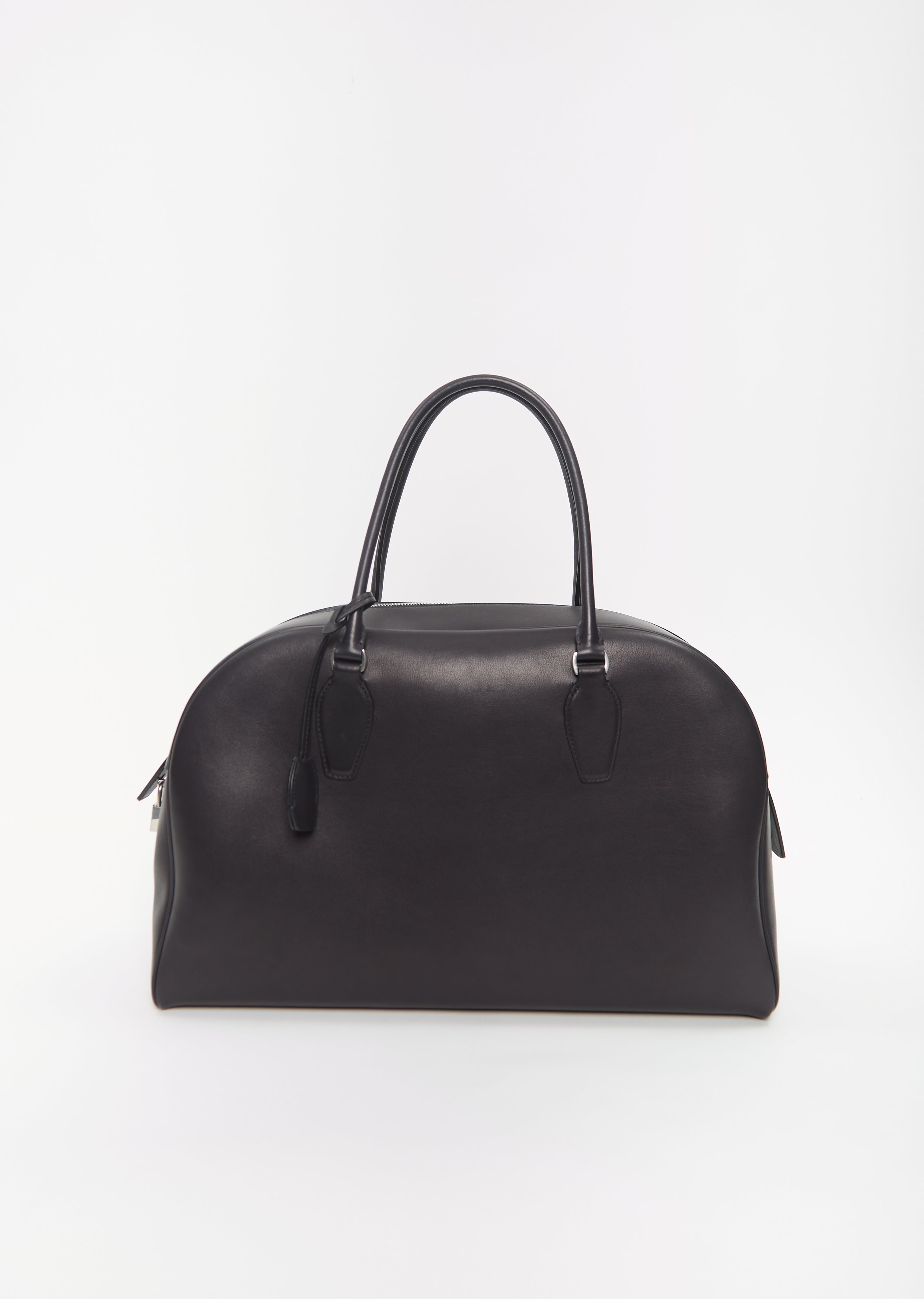 The Row black bowling bag with branded metal padlock and key in saddle leather. Features tubular handles and a top silver-toned zipper closure Sizing: One size. Measures approximately: 15.3 W x 10 H x 5.5 D in. Handle drop: 7.1 in. Color: Black ANS. 100% Saddle Leather. Made in Italy SS25TR011