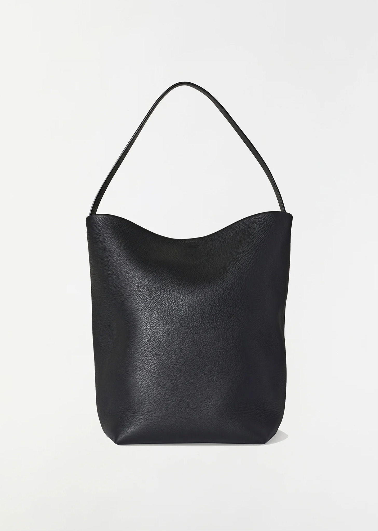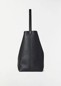 The Essentials Collection — The Row black classic large size tote bag with interior tie closure and flat handle in lux grain leather. Features embossed logo. Fully lined in suede. Sizing: One size. Measures approximately: 17 H x 15 W x 8.5 D in. Color: Black. 100% Lux Grain Leather. Made in Italy. PS25TRE01