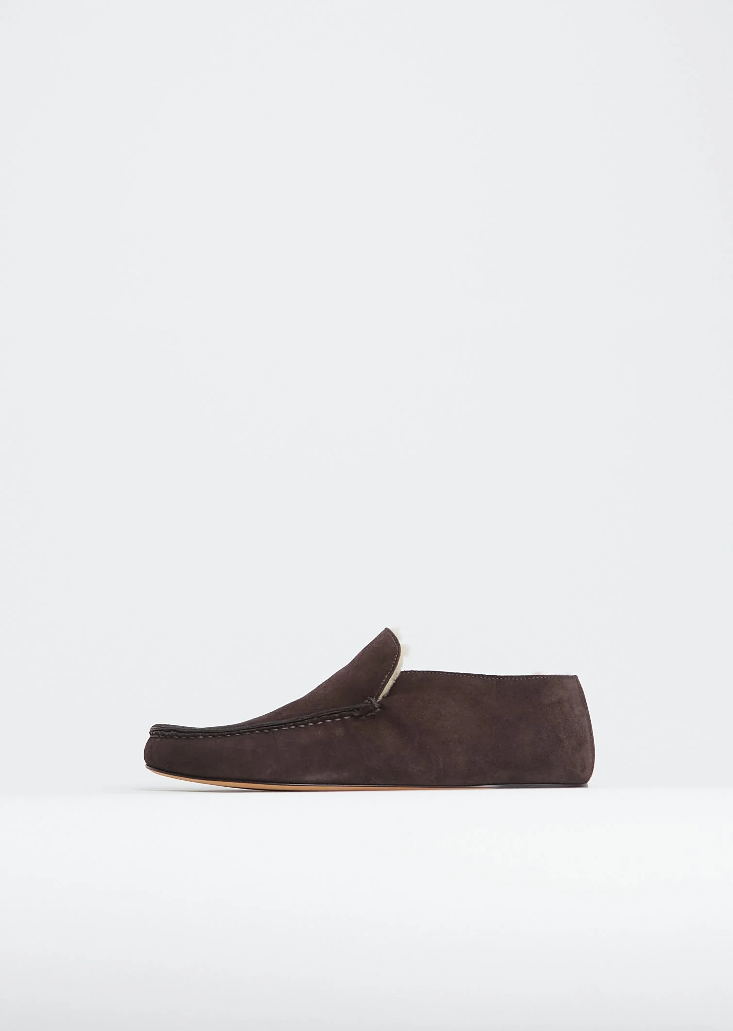 The Row dark brown r efined car shoe with a soft shearling lining in soft calfskin suede. Features a square toe and flexible rubber sole. Sizing: European (36-41). Color: Lacquer Brown. 100% Calfskin Suede . Made in Italy. PS26TR058