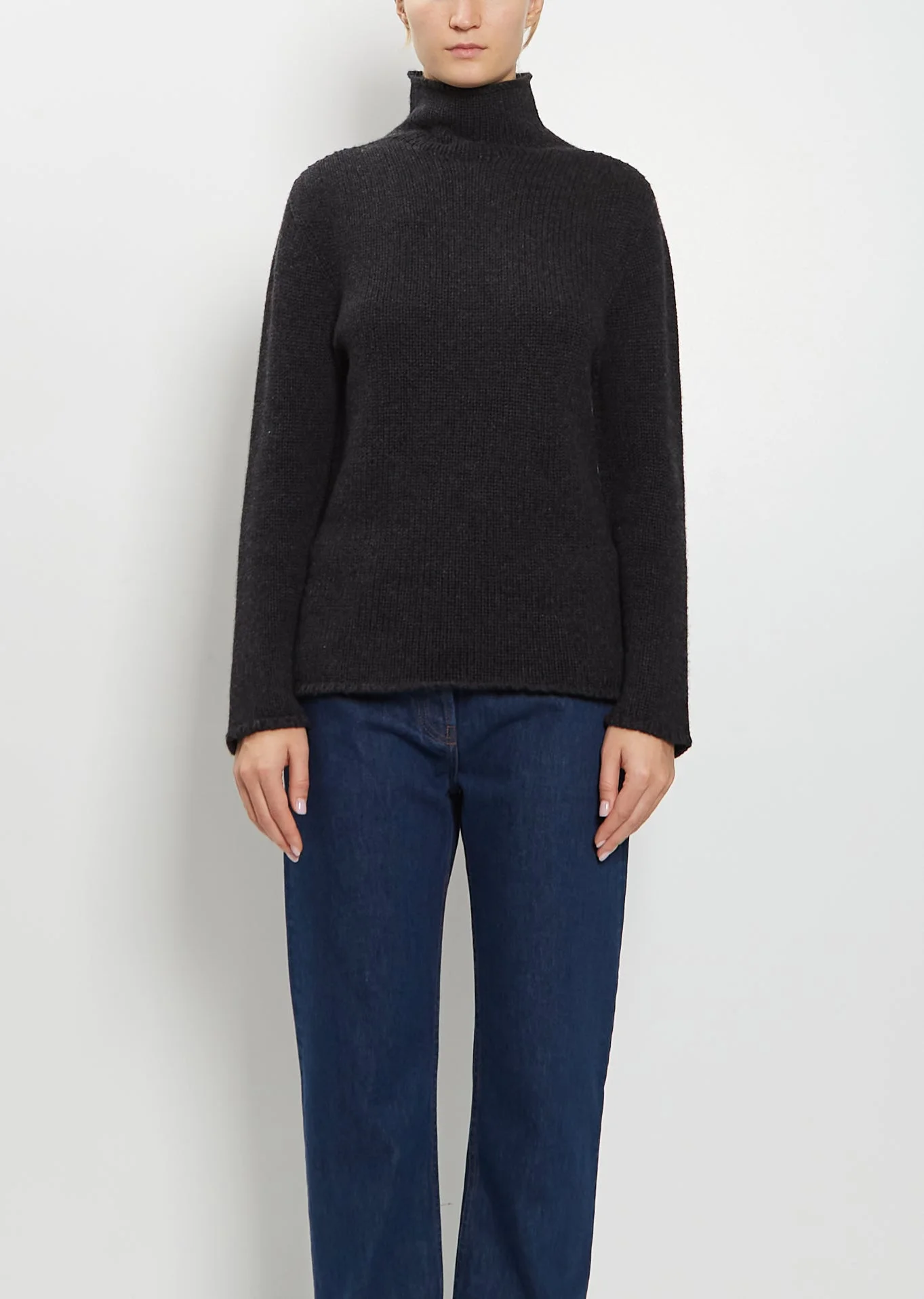 The Row charcoal melange sweater with a turtleneck in a goat cashmere knit. Features dropped shoulders, rolled edge finish at neckline, and ribbed trim finish at cuffs and hem. Also available in: Light Pebble. Sizing: Universal (XS-L). Alina is 5' 9” (175cm), bust 31”, waist 23", hips 34” and wears a size small. Color: Charcoal Melange. 100% Goat Cashmere. Made in Italy. PS26TR015
