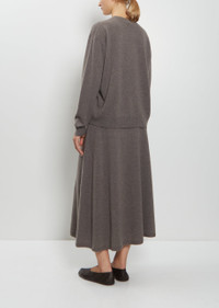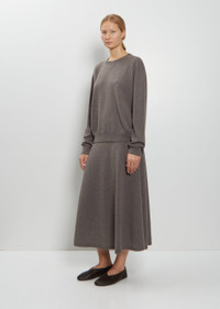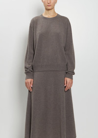 The Row brown crewneck sweater with dropped shoulders in soft mid-weight cashmere knit. Features rib trim finishings at neck, cuffs and hem. Boxy fit. Sizing: Universal (XS-L). Alina is 5' 9” (175cm), bust 31”, waist 23", hips 34” and wears a size small. Color: Brown Sepia. 100% Cashmere. Made in Italy. PS26TR024