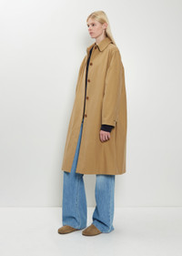 The Row dark beige single-breasted coat with a classic collar and concealed horn-hued buttons closure in cotton and cashmere blend twill. Features a single visible button at neck, slightly dropped shoulders, angled welt pockets, buttoned tabs at cuffs and a buttoned vent at back hem. Comes lined in tonal cotton. Worn with: Corzas Cashmere Cotton Top , Eglitta Cotton Jean — Blue and Hudson Suede Slide — Military . Sizing: US Women's (0-8). Abigail is 5' 10.5” (179cm) , bust 30”, waist 24”, hips 34” and wears a size 2. Color: Dark Sand. 85% Cotton, 15% Goat Cashmere. Lining: 100% Cotton. Made in Italy. FW25TR040