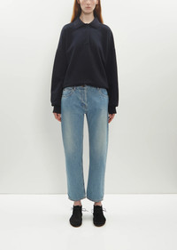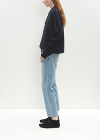 The Row light indigo blue mid-rise skinny leg 5-pocket jean in stone washed cotton denim. Features contrast top stitching and zip-fly closure. Worn with: Corzas Top — Dark Navy and Tyler Lace Up . Sizing: Waist (25-29). Kate is 5'10” (178cm), bust 30”, waist 23.5”, hips 34” and wears a size 26. Color: Light Indigo. 100% Cotton. Made in Japan. PF25TR036