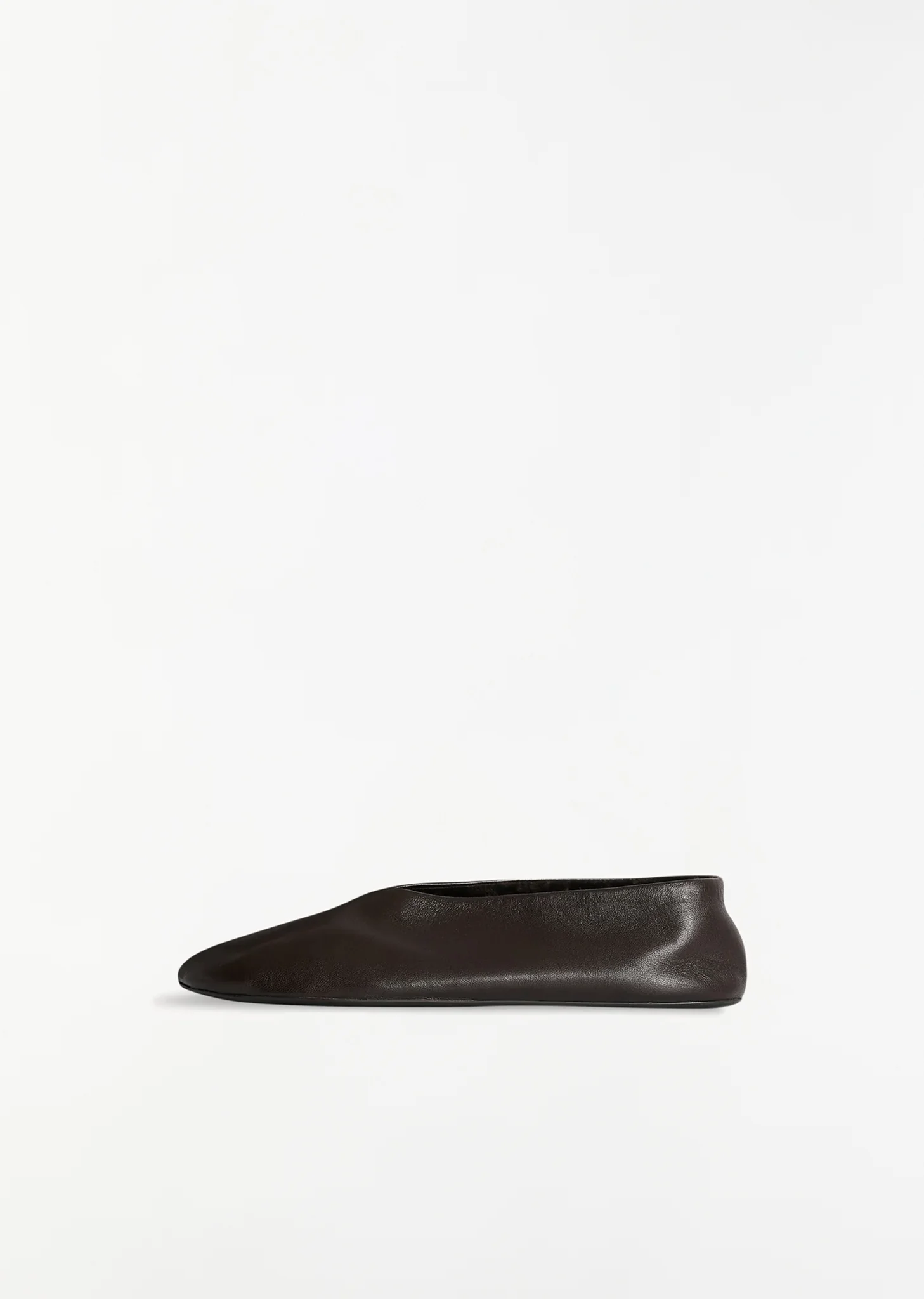 The Row lacquer brown slip-on flat with an oval toe, center front seam, and a flexible rubber-coated sole in ultra smooth nappa leather. Lined in soft tonal fur. Sizing: European (36-41). Color: Lacquer Brown. 100% Ovis Aries. Made in Italy. PS26TR060