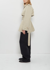 The Row sandstone beige short trench coat with detachable sleeves and a storm flap in pima cotton gabardine. Features a spread collar, a detachable self belt, belt loops, open sides with a single button closure, buttoned tabs at shoulders and cuffs, and a hook and concealed button placket at front. Comes unlined. Sizing: US Women's (0-8). Alina is 5' 9” (175cm), bust 31”, waist 23", hips 34” and wear a size 2. Color: Sandstone. 100% Pima Cotton. Made in Italy. PS26TR009